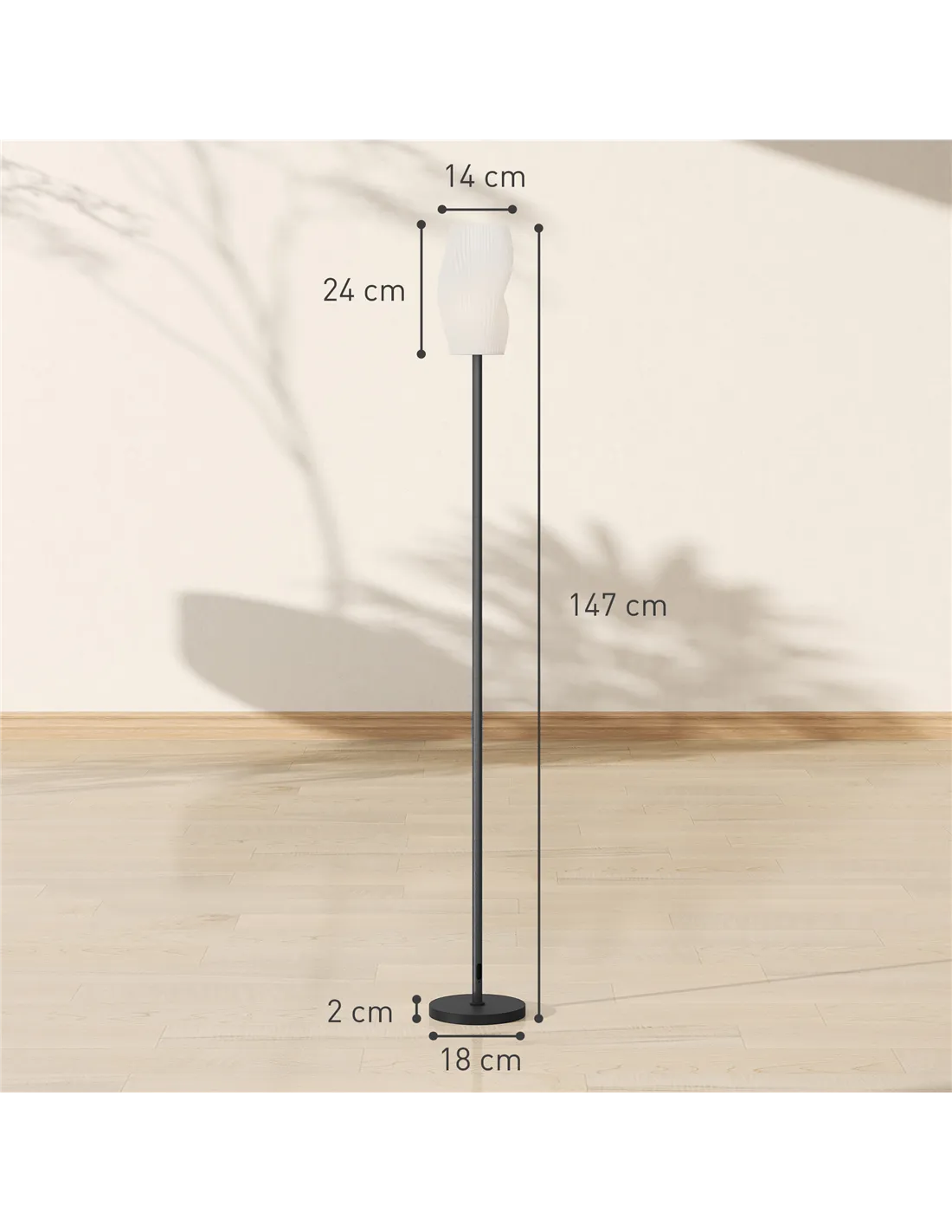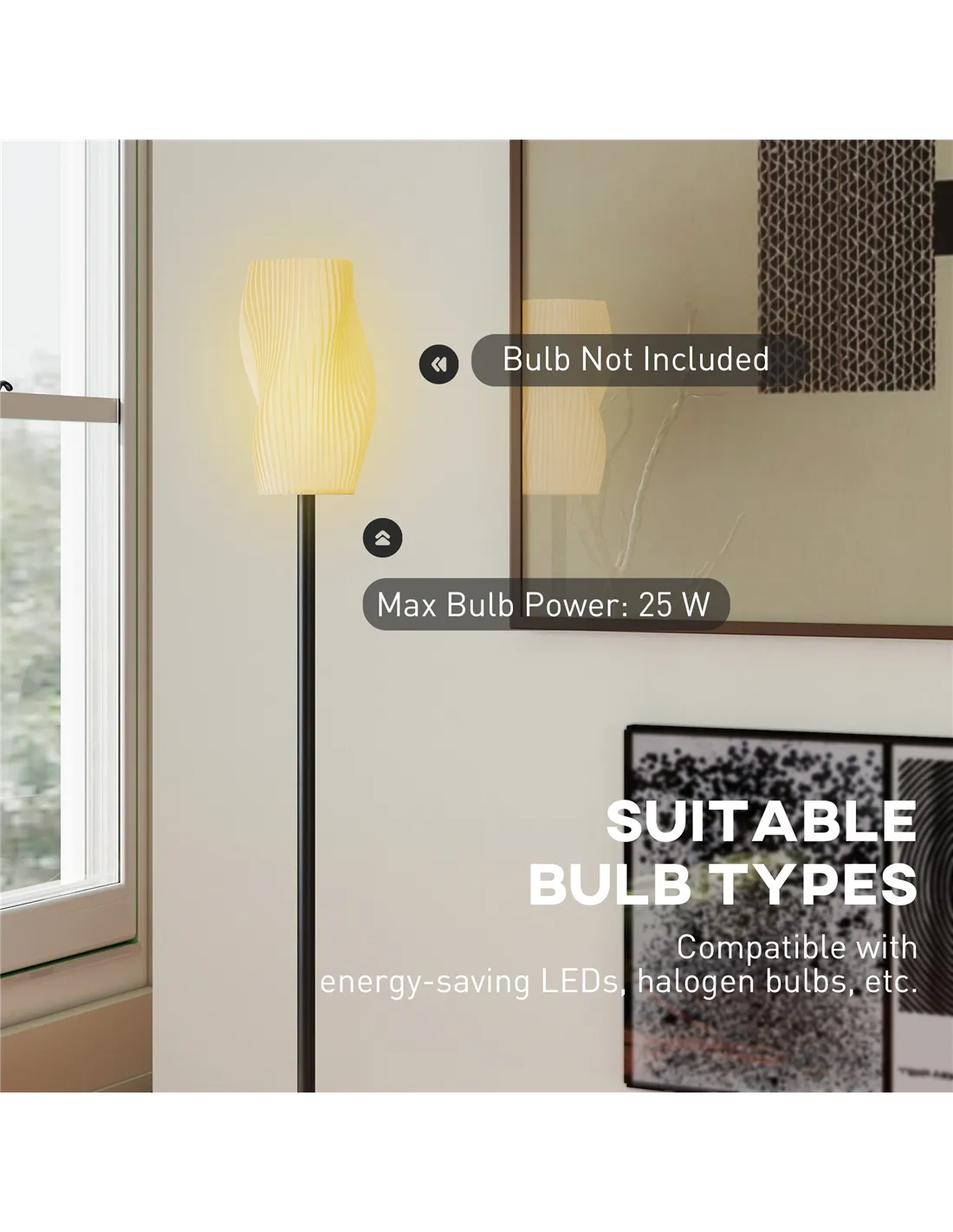 Elevate your home's aesthetic with the HOMCOM Floor Lamp, a contemporary white standing lamp perfect for British living rooms, bedrooms, and offices. Its striking 3D-printed lampshade showcases unique flowing curves, providing a sophisticated focal point and diffused light. This modern tall pole lamp integrates seamlessly into minimalist or eclectic décors. Enjoy simple operation with its accessible foot switch, offering immediate control over your space's illumination. The versatile E27 holder supports bulbs up to 25W, allowing you to tailor the brightness and mood. Constructed from robust ABS composite and a painted metal body, this lamp ensures durability. It stands at 147cm, making a refined statement in your chosen setting. Assembly is quick, completing in under five minutes.