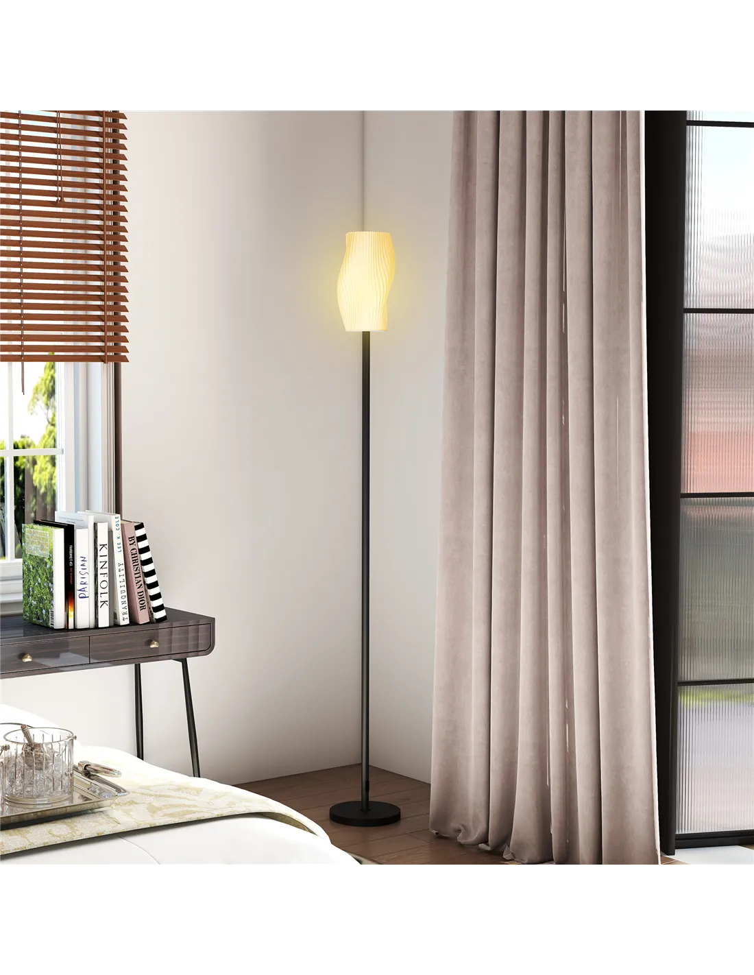 - 3D-printed lampshade with flowing curves enhances room aesthetics