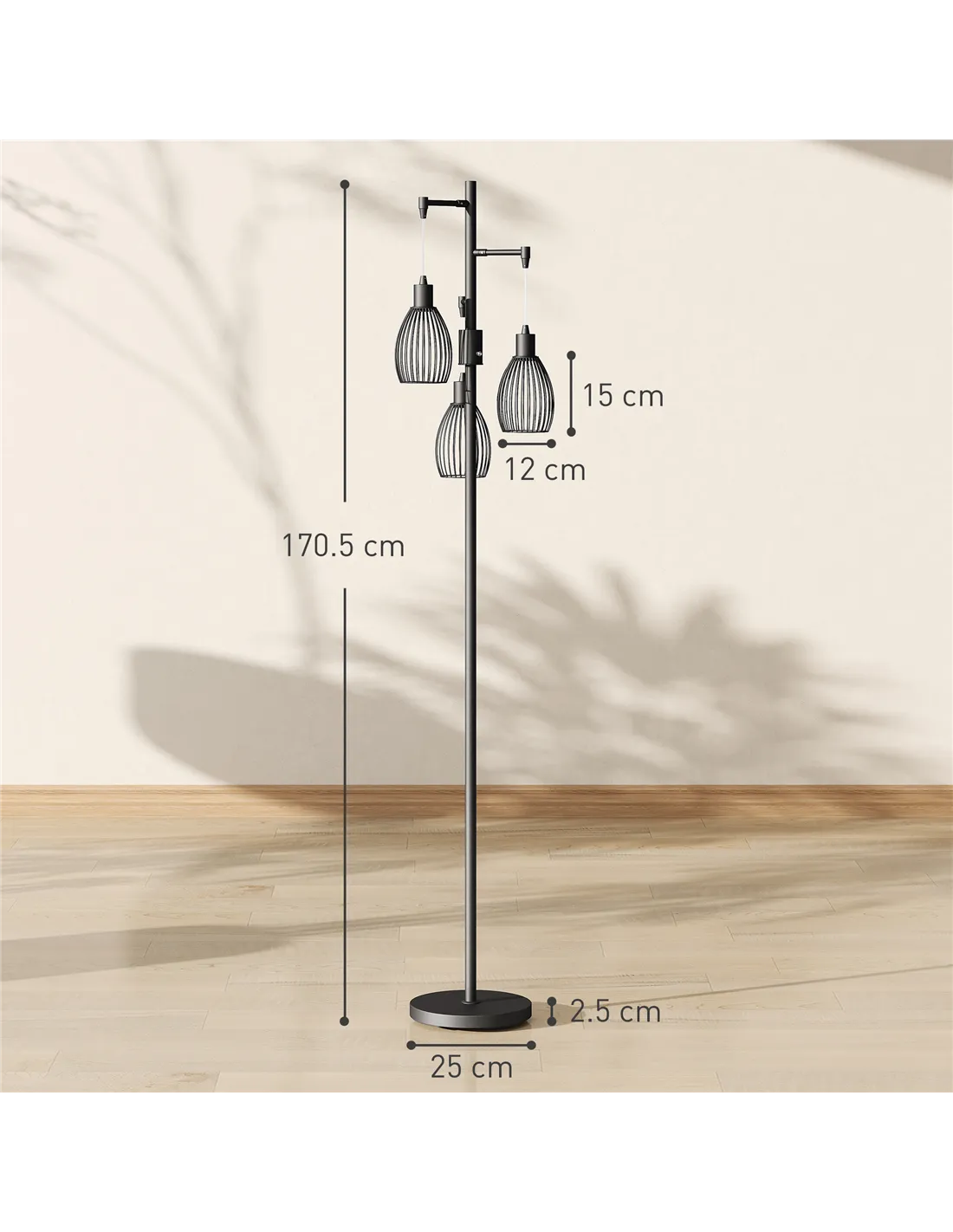 Introduce a distinct industrial aesthetic to your living space with the HOMCOM 3-Light LED Floor Lamp. This 170cm standing lamp provides versatile illumination for any room in your UK home. Its industrial design features robust steel construction and three striking steel wire cage lampshades, presented in a sleek black finish. This lamp offers adaptable lighting with its dimmable functionality. You can tailor the brightness to your preference using the knob switch. The 2700K colour temperature emits a warm, inviting glow, perfect for creating a comfortable atmosphere throughout your home. Position this durable lamp in your living room, bedroom, dining room, or study. It delivers effective illumination and a powerful style statement. The stable round base ensures security. It accommodates E27 screw bulbs up to a maximum of 40W. This industrial floor lamp brings both durability and sophisticated design to modern interiors.