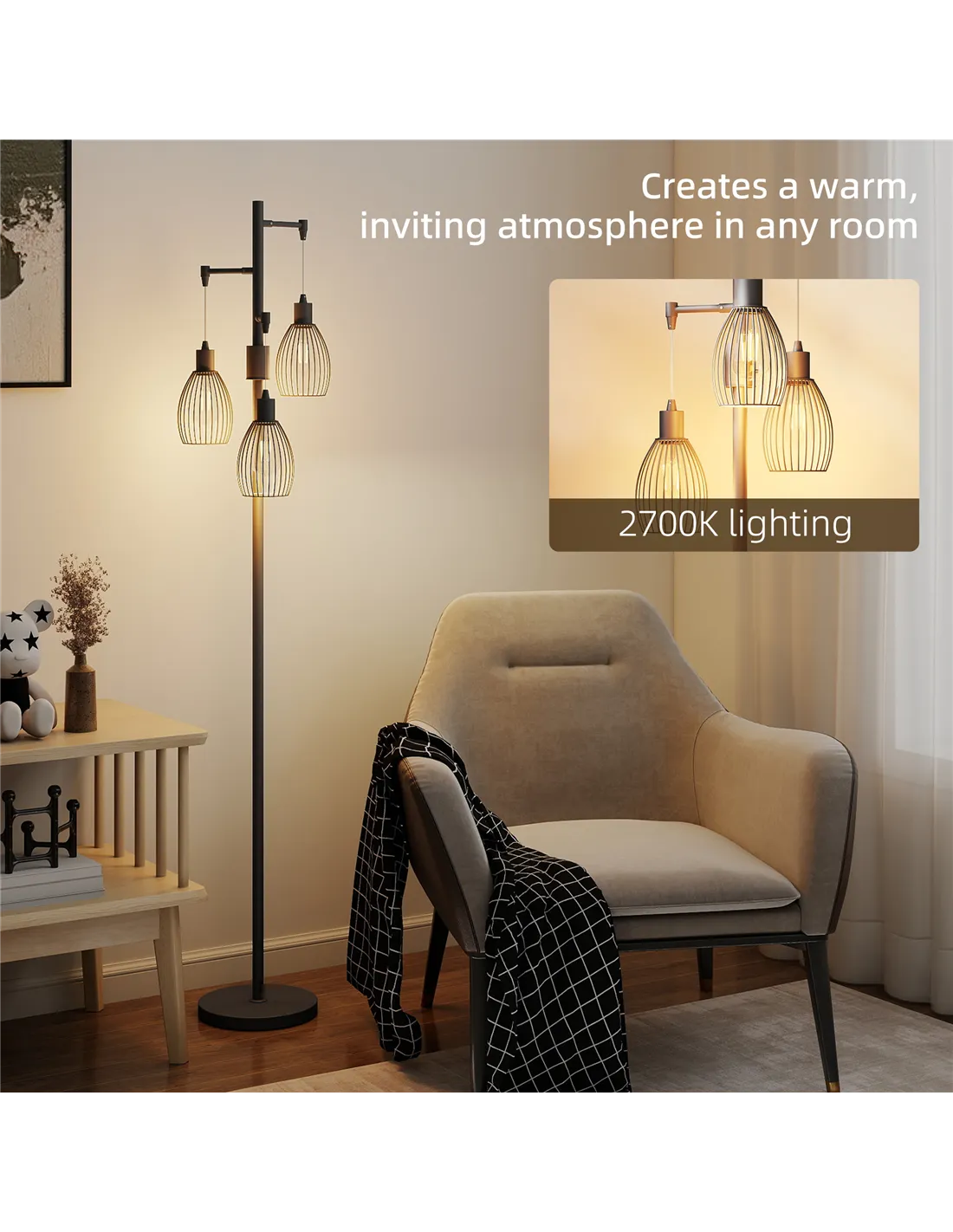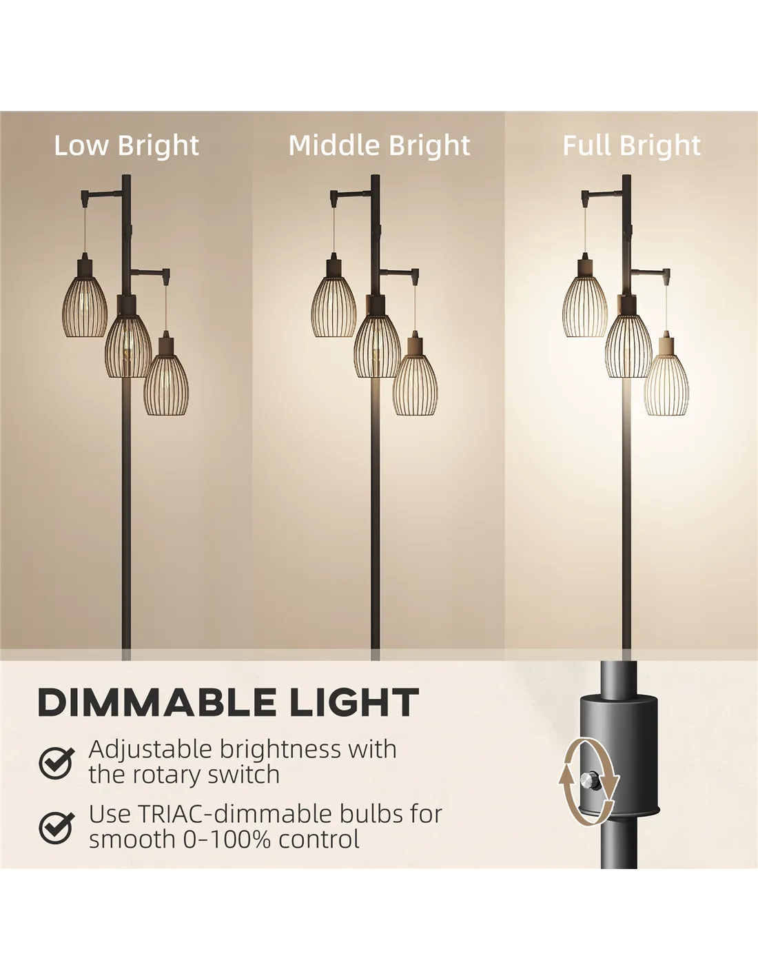 - A: This HOMCOM 3-Light LED Floor Lamp provides 2700K lighting, creating a warm atmosphere. It features a knob switch for adjusting light brightness.