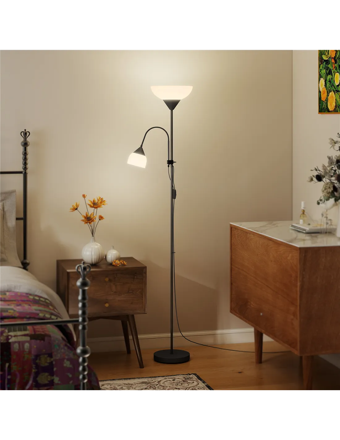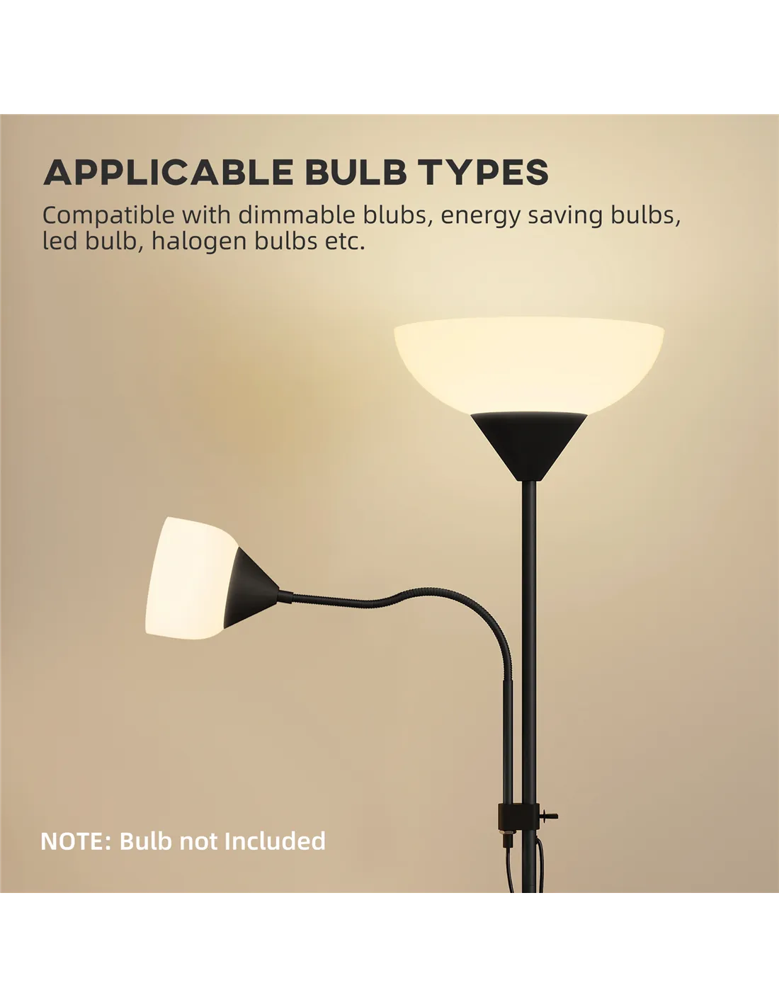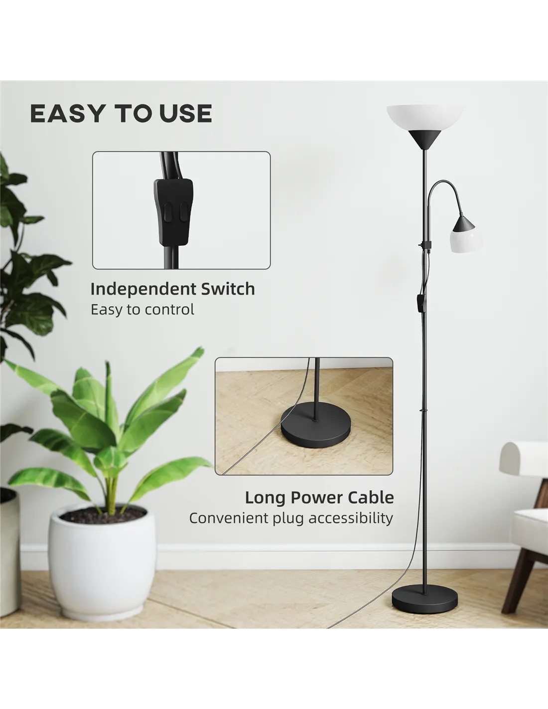Illuminate your living space with the HOMCOM LED Floor Lamp. This 180cm tall standing lamp combines a main uplighter with an adjustable gooseneck reading light, providing versatile illumination for your home. Its elegant mother-and-child design offers both ambient lighting and focused task lighting, perfect for reading or hobbies. The sturdy metal frame ensures long-lasting use, while protective cone shades enhance safety. Control each light independently using the two separate switches. The flexible mid-arm allows precise light direction. Designed for UK homes, it features a British Standard plug and requires E27 and E14 bulbs, which are sold separately. This black standing lamp measures 28cm in diameter and stands 179.5cm tall, fitting seamlessly into various interior styles. Assembly is straightforward, making it a functional addition to your decor.