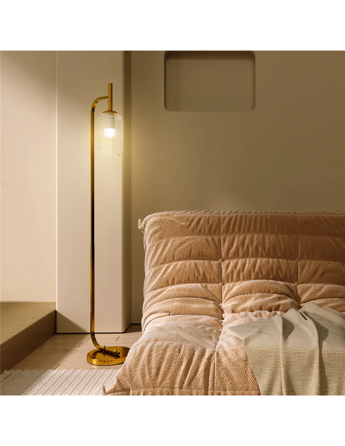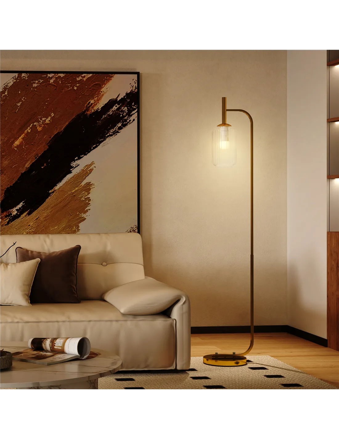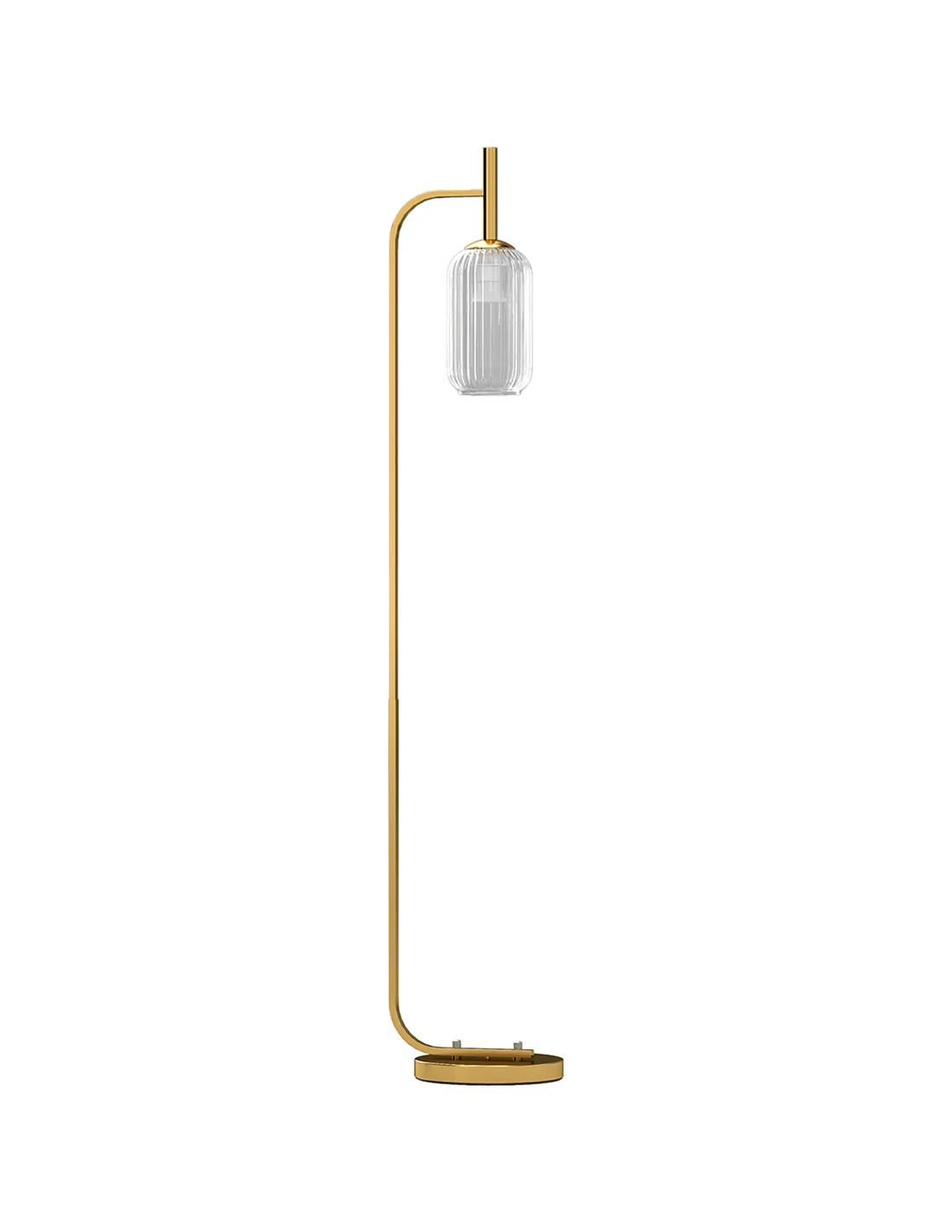 The HOMCOM LED Floor Lamp offers a modern lighting solution for your British home. This standing lamp combines a sleek gold-tone metal frame with a captivating three-dimensional texture glass lampshade. It provides ideal illumination for living rooms or bedrooms. An integrated E27 base supports a 6W, 700lm LED bulb, delivering a clear 5000K light. Operate this lamp easily with its simple foot switch. Standing 152cm high, it features a stable 25cm diameter base, ensuring secure placement in your space. The lampshade measures Φ14 x 20.5H cm. Its 1.8m power cord allows for flexible positioning. Enhance your home aesthetics with this functional and stylish floor lamp. Assembly is straightforward. This 220-240V, 50Hz lamp boasts an E energy efficiency rating.