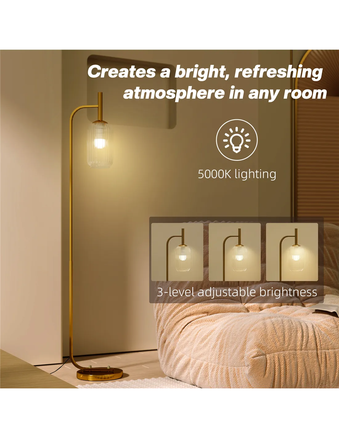 HOMCOM LED Floor Lamp for Living Room with Glass Lampshade, Modern Standing Lamp with Foot Switch, Adjustable Brightness, 2700K for Bedroom, Gold Tone