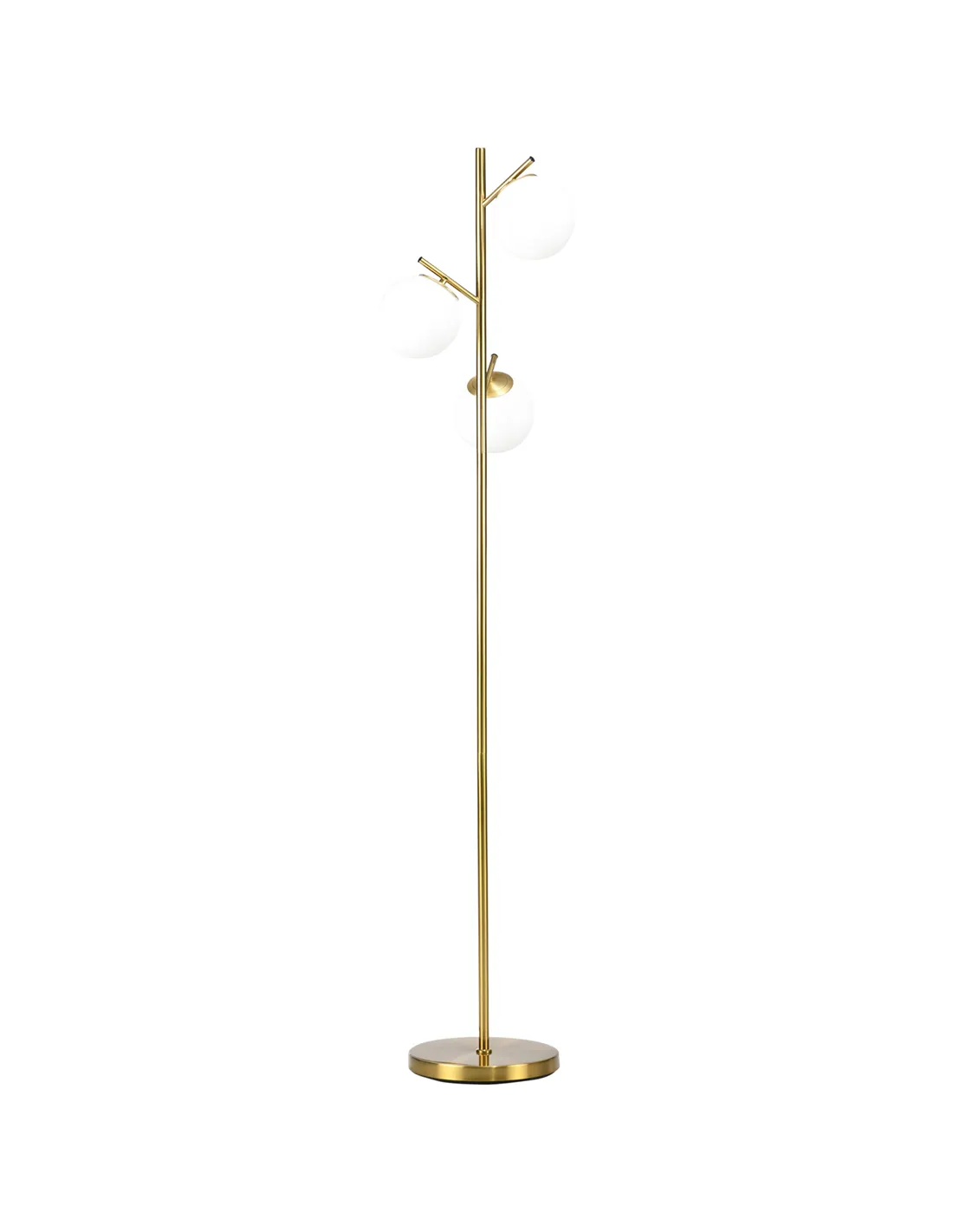 Elevate your home's lighting with the HOMCOM 3-Light Tree Floor Lamp. This modern standing lamp brings versatile illumination and striking design to your living room or bedroom. Its tall steel structure, finished in a gold tone, supports three elegant globe lampshades. Adjust your room's ambience instantly with three colour temperature options: 3000K for a warm glow, 4000K for natural light, or 6000K for bright illumination. Each light points in a different direction, ensuring a wide, even spread of light across your space. The sturdy metal frame includes a stable round base, offering lasting quality. A convenient foot switch allows easy operation, connected by a generous 1.8m power cable. This lamp is easy to assemble, and it uses E27 base bulbs, with three included to get you started immediately.Features:
