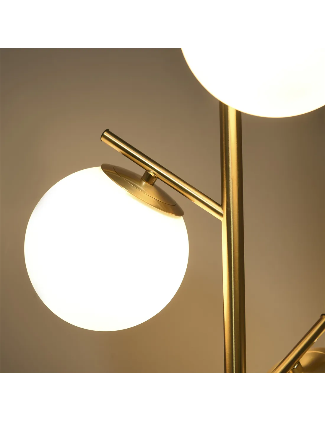 - A: The overall dimension of the lamp is Φ27 x 169H cm. It features a durable metal frame with a gold tone finish and three white glass globe lampshades. The base size is Φ27 x 2.5H cm.