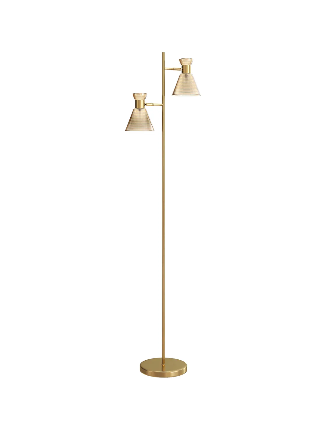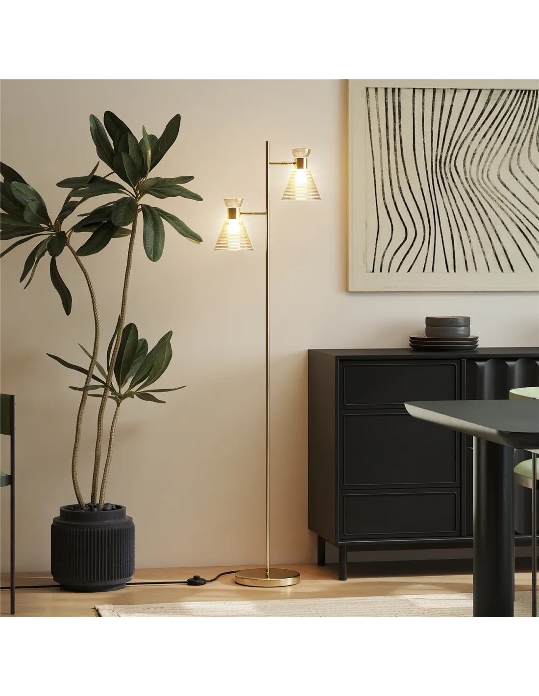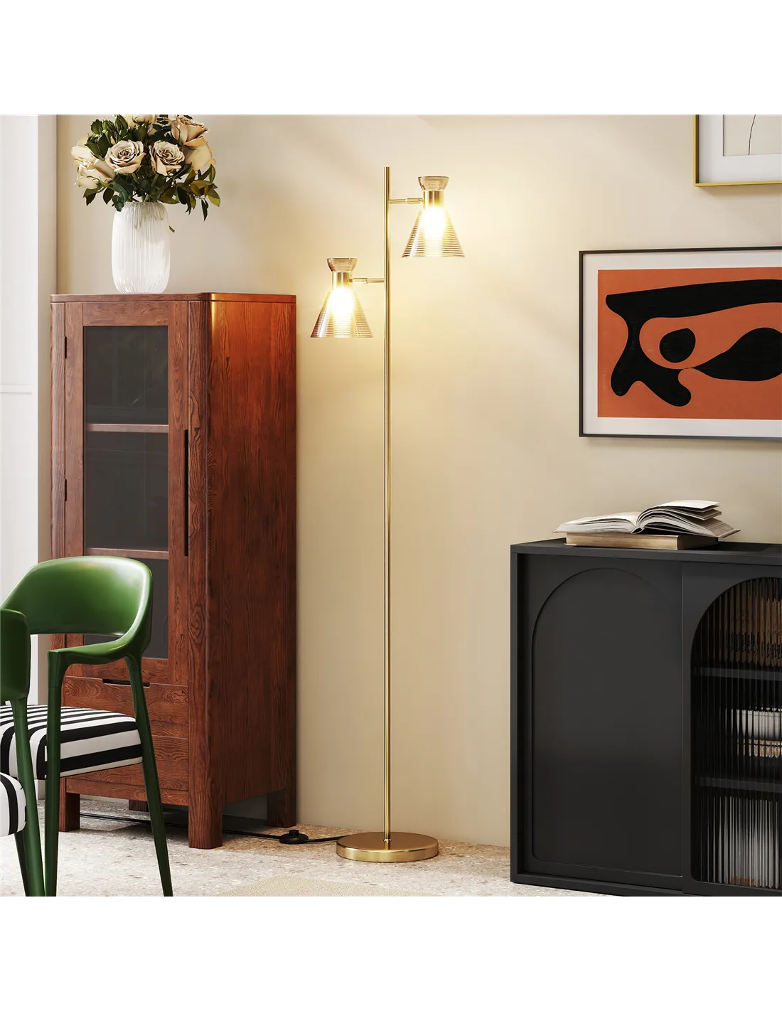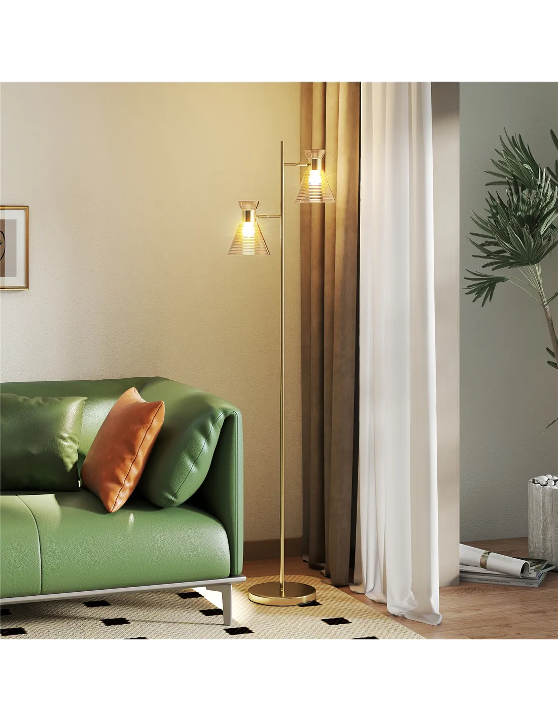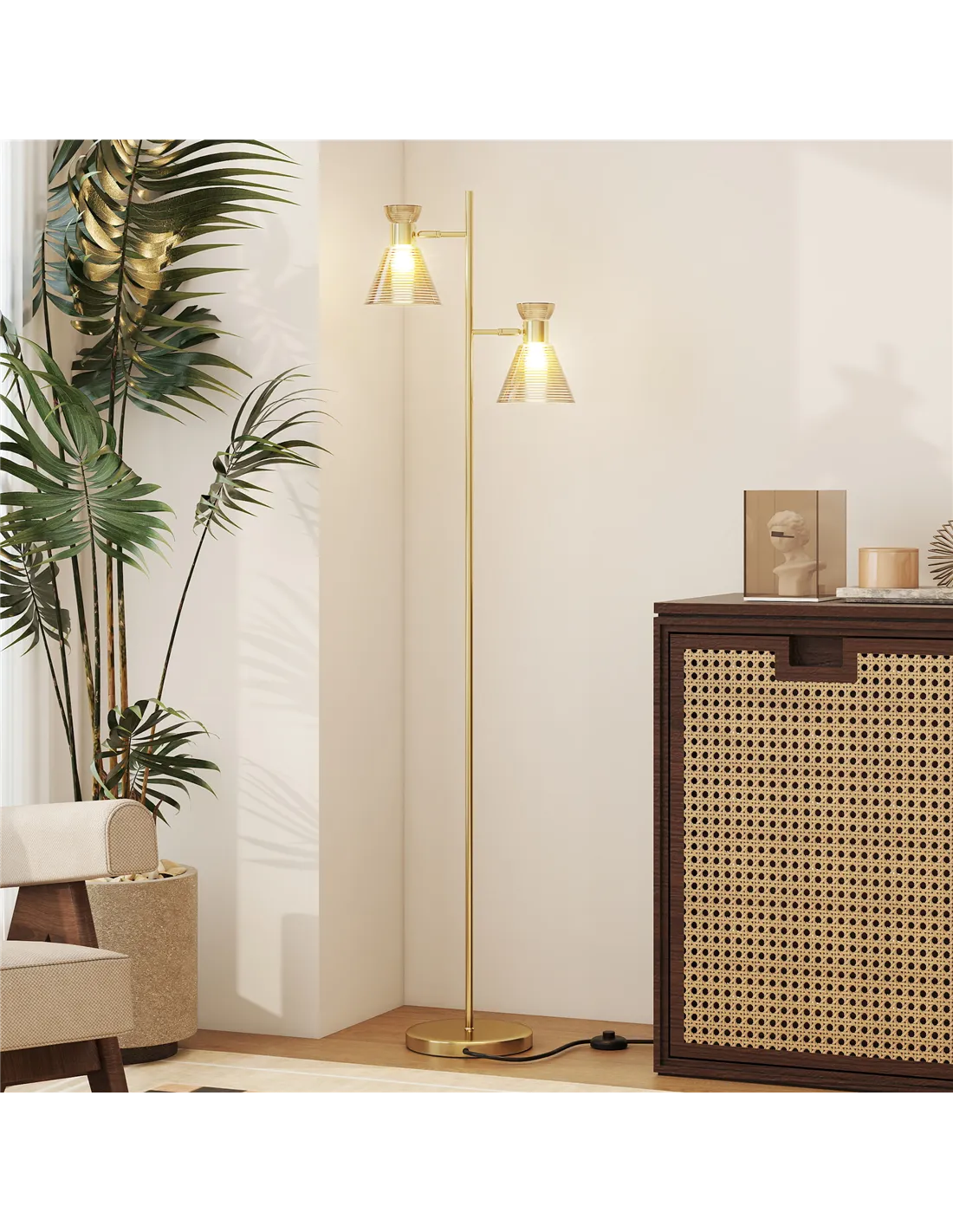 The HOMCOM Floor Lamp with Adjustable Dual Head offers versatile illumination for your living room or bedroom. This modern standing lamp features two independently adjustable heads, each moving 45°, providing both focused task lighting and a soft, ambient glow. Elegant floral glass shades, finished in a luxurious gold tone, enhance your interior decor. The amber frosted glass diffuses a warm, glare-free light, creating a refined and cosy atmosphere. Equipped with an E27 socket, it accepts any E27 bulb up to 40W (bulb not included), allowing for personalised brightness. Control the lamp effortlessly with its integrated foot switch. A stable, weighted base ensures secure placement. This HOMCOM lamp combines sophisticated design with practical functionality for UK homes. Assembly is straightforward, taking around 15 minutes without tools.