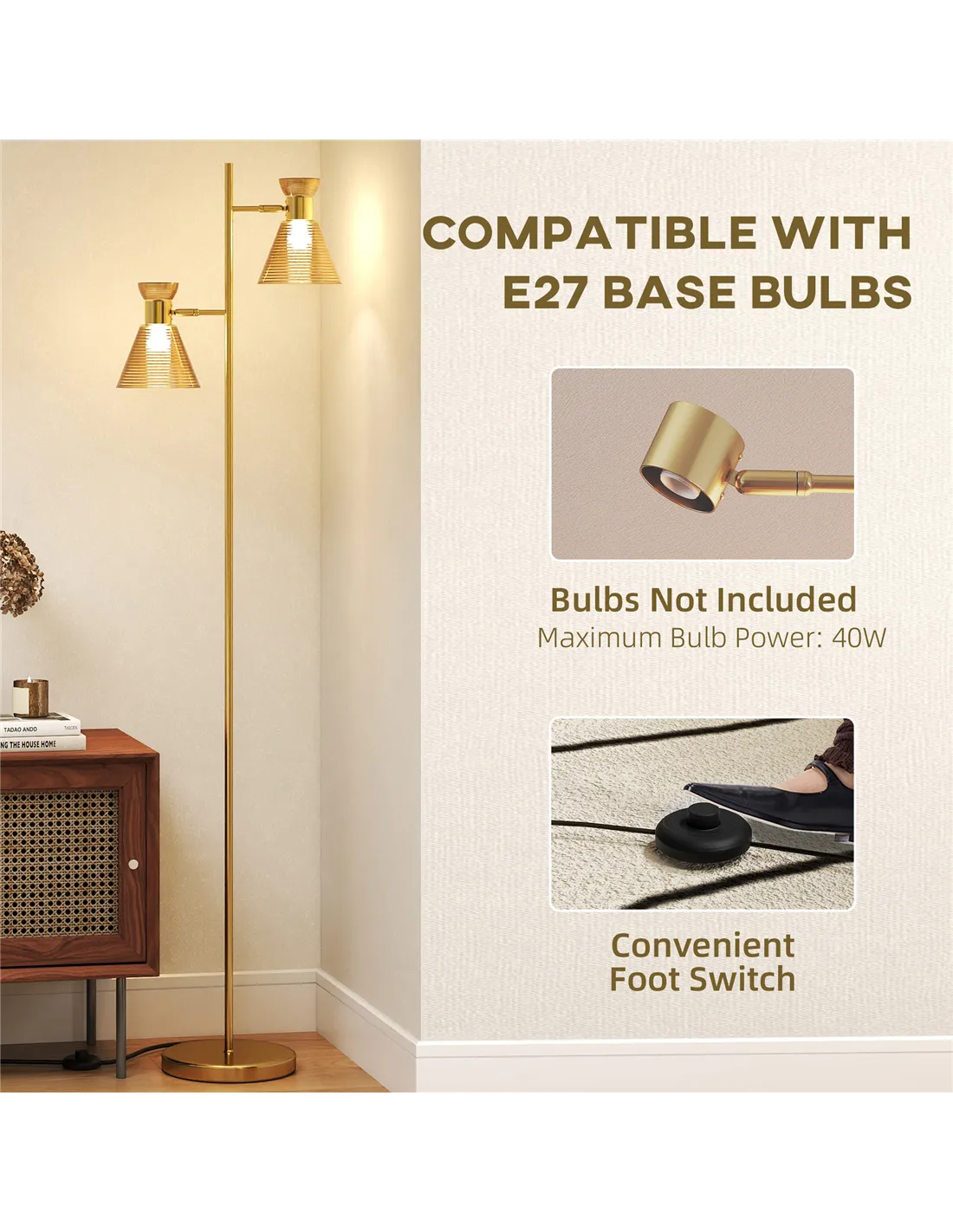 HOMCOM Floor Lamp with Adjustable Dual Head, Modern Standing Lamp with Floral Glass Shades and Foot Switch for Living Room Bedroom, E27 Socket, Bulb Not Included, Gold Tone