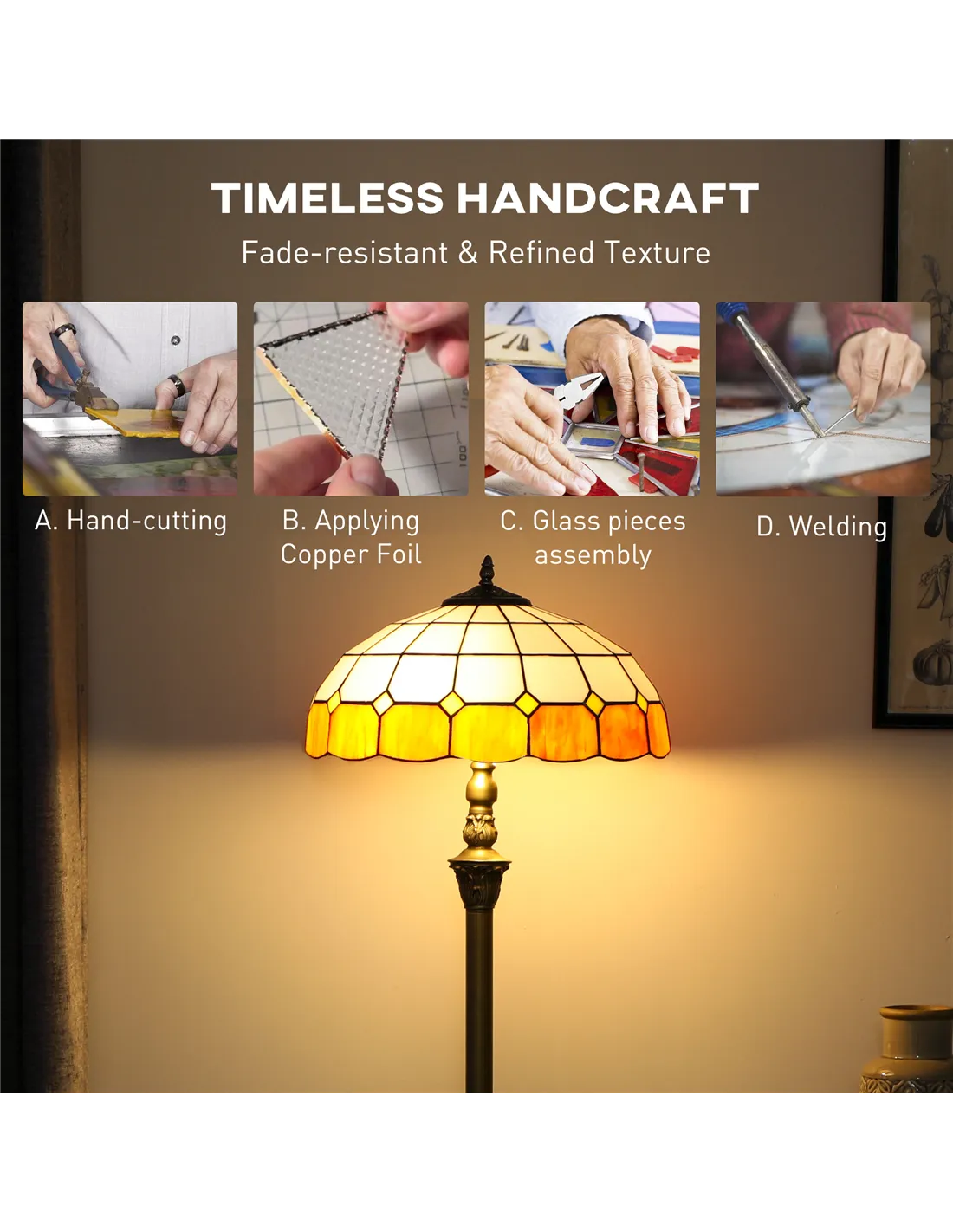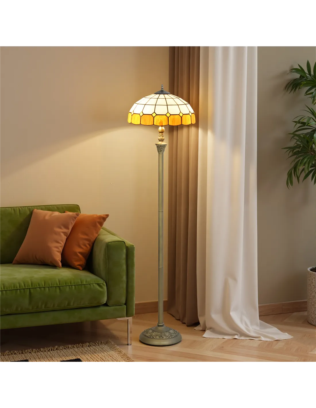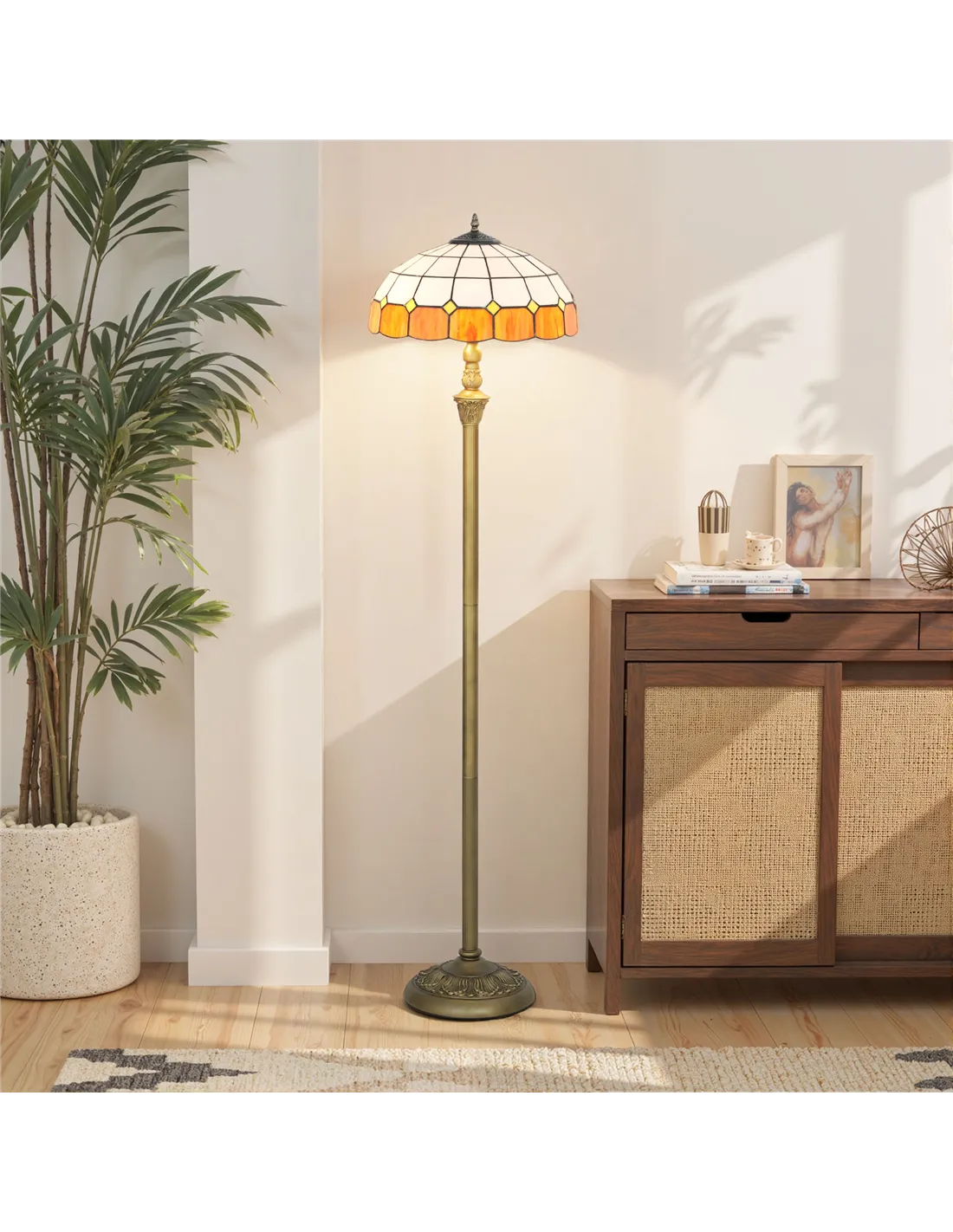Enhance your UK home's interior with the HOMCOM Tiffany-Style Floor Lamp, a 152cm tall vintage standing lamp designed for discerning tastes. This striking piece features a handcrafted stained glass shade, blending white pieces with a vibrant orange trim. The robust bronze-tone metal frame offers stability and durability, enhanced by elegant petal carvings. It integrates dual E27 sockets, supporting two bulbs up to 40W each, providing beautiful ambient light for your living room or bedroom. Operation is effortless via the convenient foot switch. This lamp delivers both classic elegance and practical illumination, making it a focal point in any space while ensuring a welcoming atmosphere. Its distinctive design adds character and refined aesthetics.