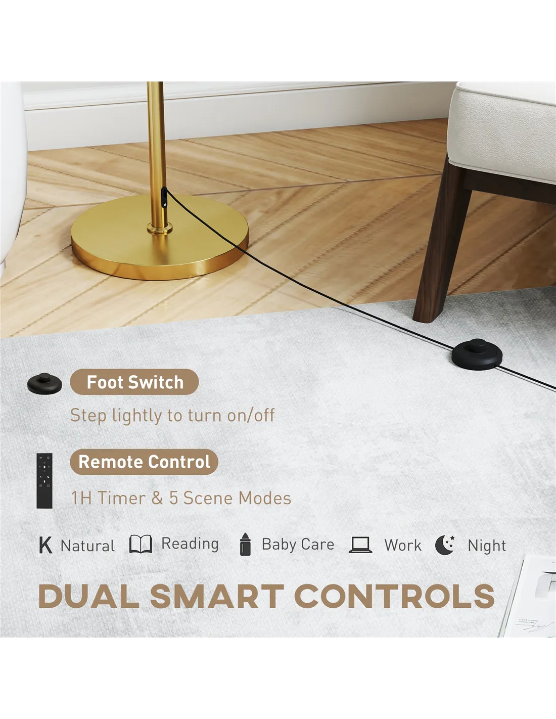 HOMCOM Floor Lamp with Remote, Height Adjustable Standing Lamp with Linen Shade, Dimmable with 3000K-6000K Adjustable Colour Temperatures, Foot Switch for Living Room Bedroom Office, Gold Tone