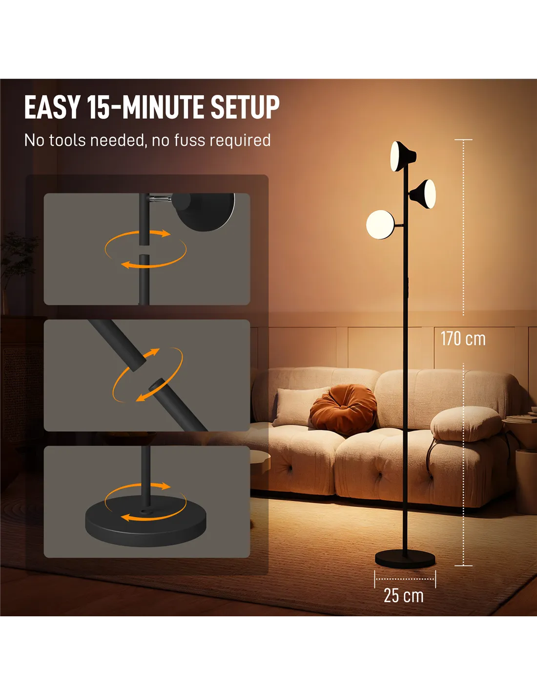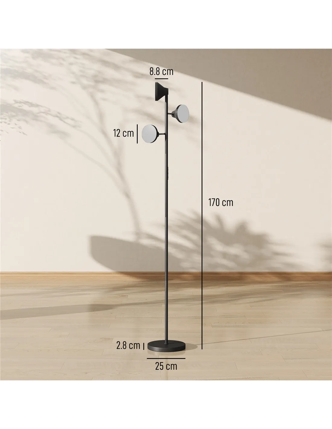 Enhance your living space with the HOMCOM Three-Lamp Multi-Adjustable Floor Light in Black from FastDaddy. This versatile lamp offers extensive lighting control. It features three independently adjustable heads, each rotating 350 degrees and tilting 180 degrees. Tailor your illumination exactly where you need it. Choose from a wide range of colour temperatures, 2700K to 6000K white, or select RGB colours to create your desired atmosphere. Adjust brightness up to 4150 lumens. The lamp offers dedicated reading and night modes, plus nine distinct scene settings. Control your light using the remote or the integrated touch panel. A convenient one-hour timer manages energy use. One-click restore simplifies mode selection. Its stable base ensures secure placement, preventing tipping. Assembly is straightforward. This black floor light measures Φ25 cm x 170H cm, a practical addition for any UK home.