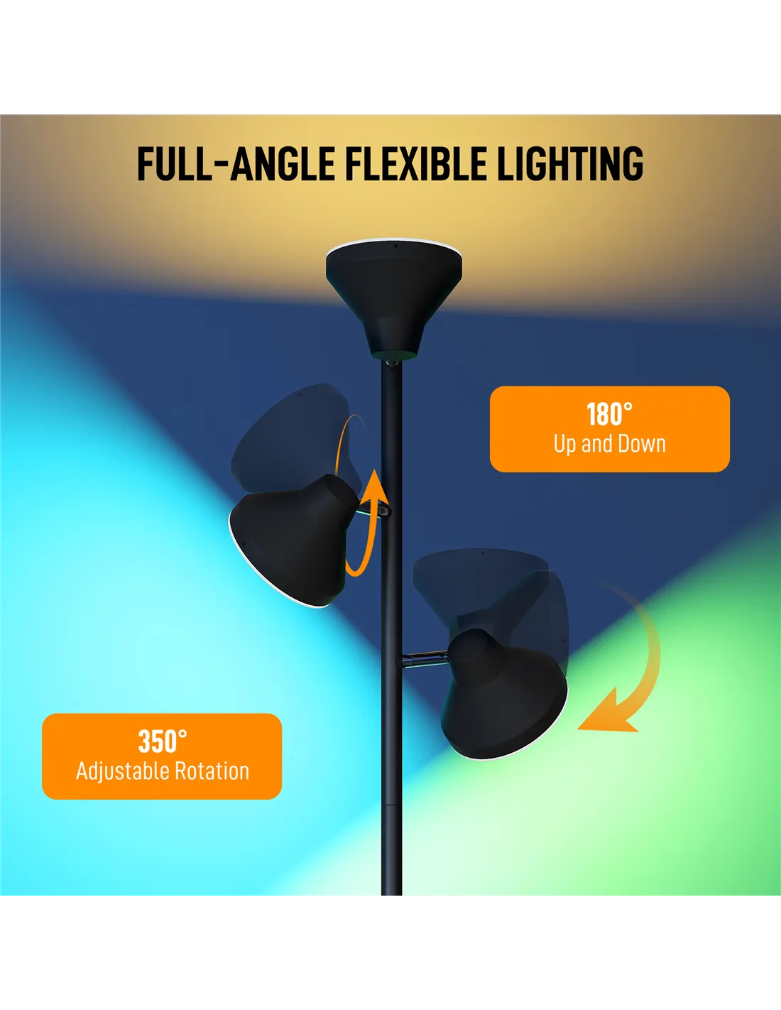 - Three adjustable light heads, each adjustable: rotate 350° and tilt 180° to glare at the position you want