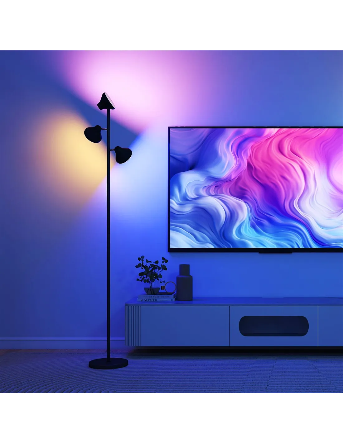 - A: The HOMCOM Three-Lamp Multi-Adjustable Floor Light offers both 2700K to 6000K white lighting and RGB colours. It has adjustable brightness, providing up to 4150 lumens.