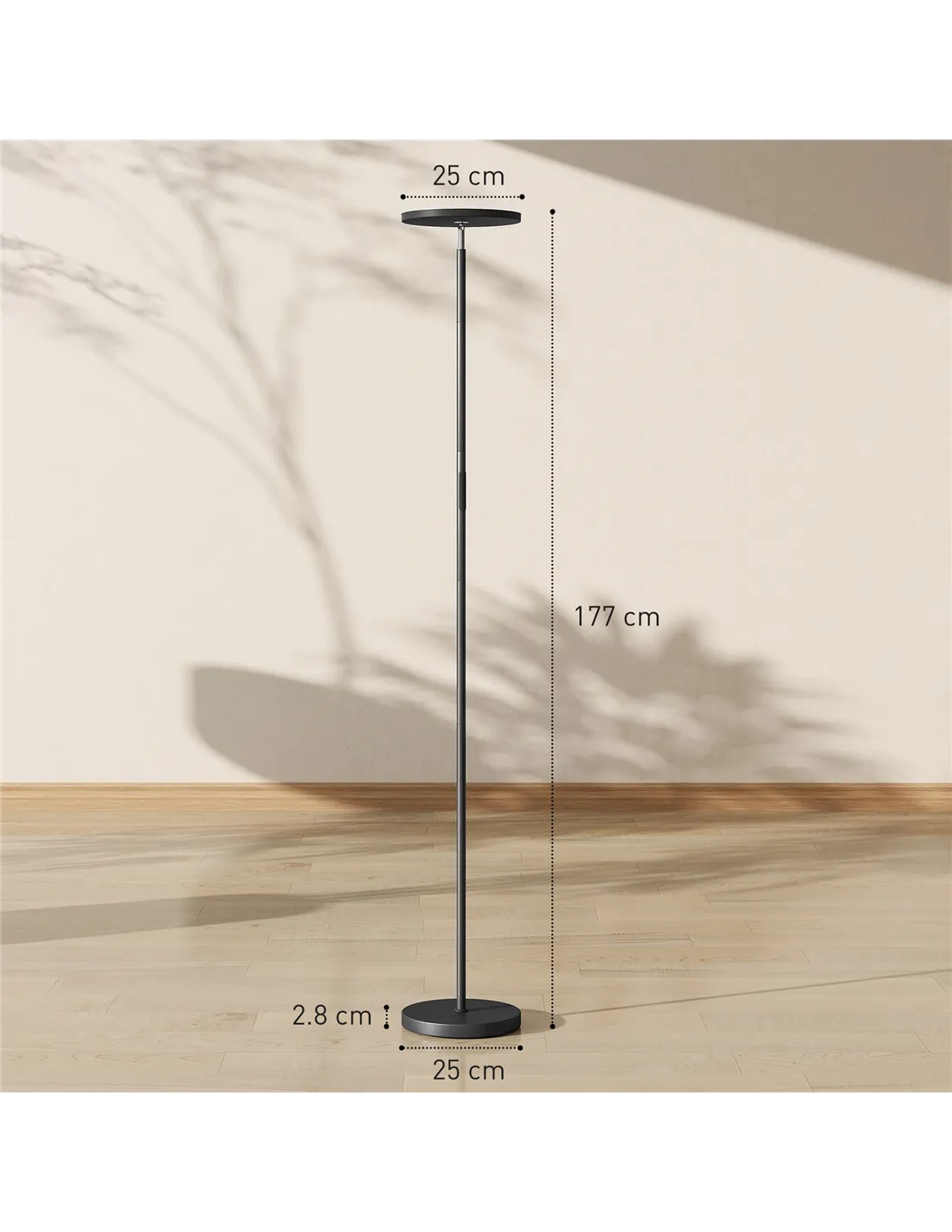 The HOMCOM RGB Uplighter Floor Lamp offers versatile lighting for your UK home. This tall, black standing lamp enhances both living rooms and bedrooms. Experience dynamic RGB modes, creating vibrant atmospheres for parties and gaming sessions. Adjust the light output with stepless dimming, delivering up to 2700 lumens, suitable for any activity or mood. Select from a wide colour temperature range, from warm 2700K to cool 6000K, tailoring your environment precisely. Control your lighting conveniently using the included remote or the integrated touch panel. A 350° rotatable head provides precise, glare-free directional lighting, directing light where needed. Its stable base prevents tipping, ensuring safety for little ones and pets. This dimmable floor lamp combines modern functionality with precise lighting control, making it a practical addition for homeowners seeking adaptable illumination.Features: