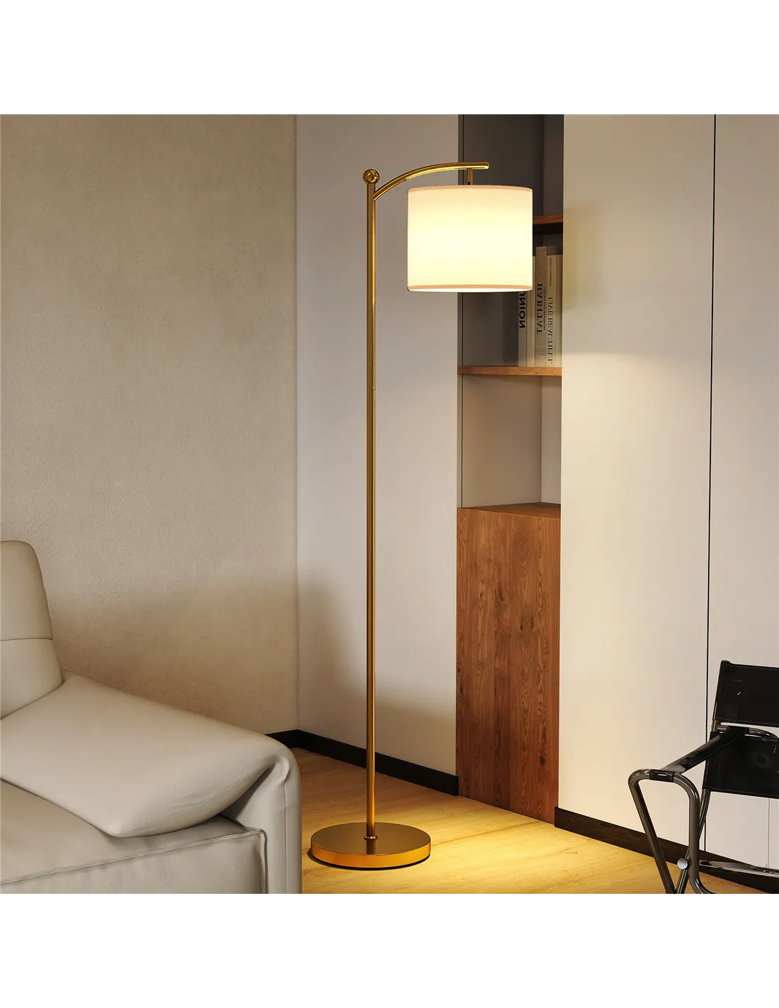 Illuminate your home with the HOMCOM LED Floor Lamp. This gold tone standing lamp provides versatile lighting for any UK living space. Control 11 levels of adjustable brightness and colour temperature, from warm 3000K to cool 6000K white light, using the included remote. The remote attaches magnetically to the lamp pole for easy access. Achieve optimal ambiance with 800 lumens of light output. This functional floor lamp offers specific modes: natural light, reading, night light, work, and baby feeding. A 60-minute timer function adds convenience. Crafted with a robust metal frame, baking varnish finish, and a stylish cream fabric shade, this lamp complements diverse decor. An E27 bulb base offers compatibility. Assembly takes approximately 30 minutes. Enhance your home with a blend of style and practicality from FastDaddy.