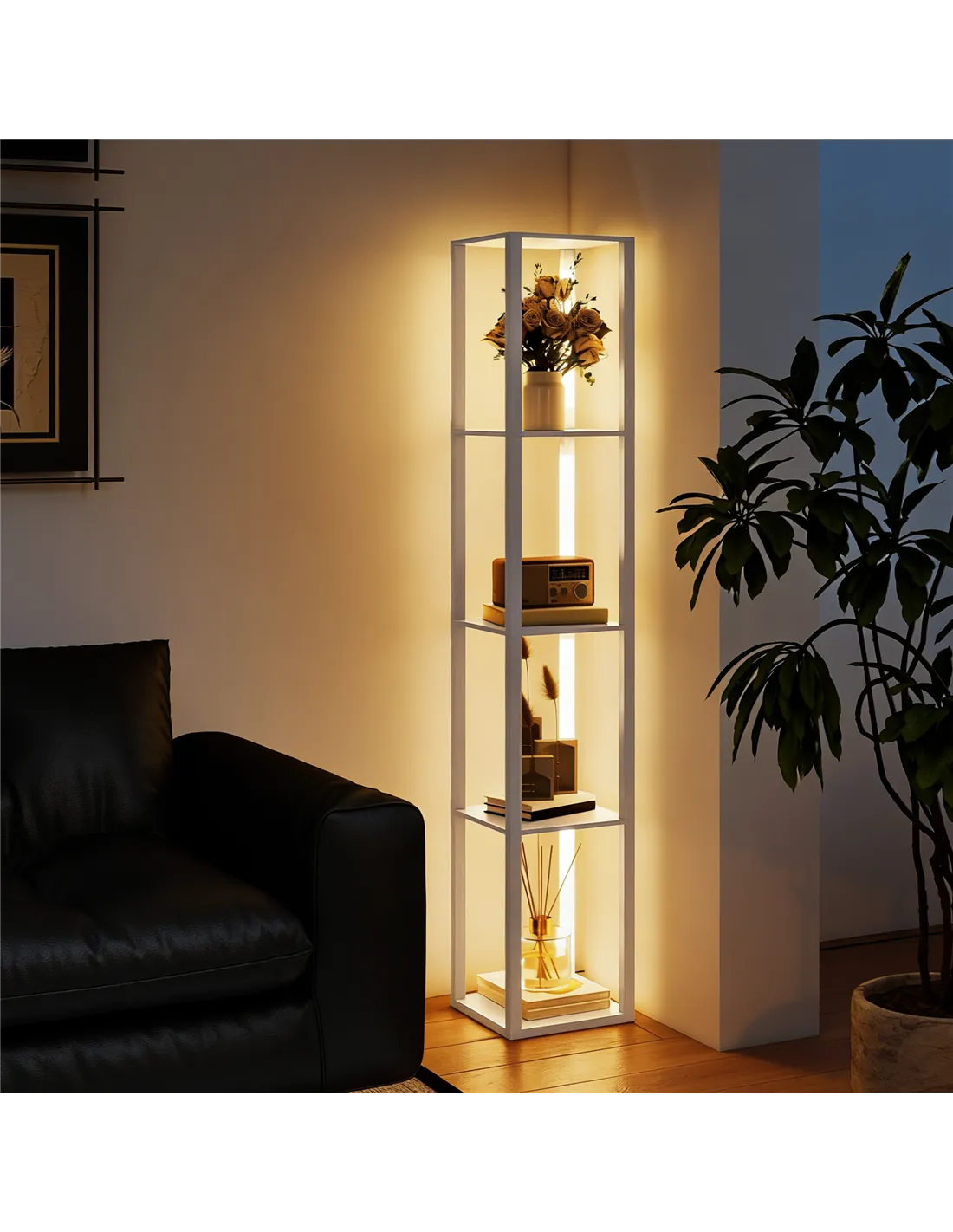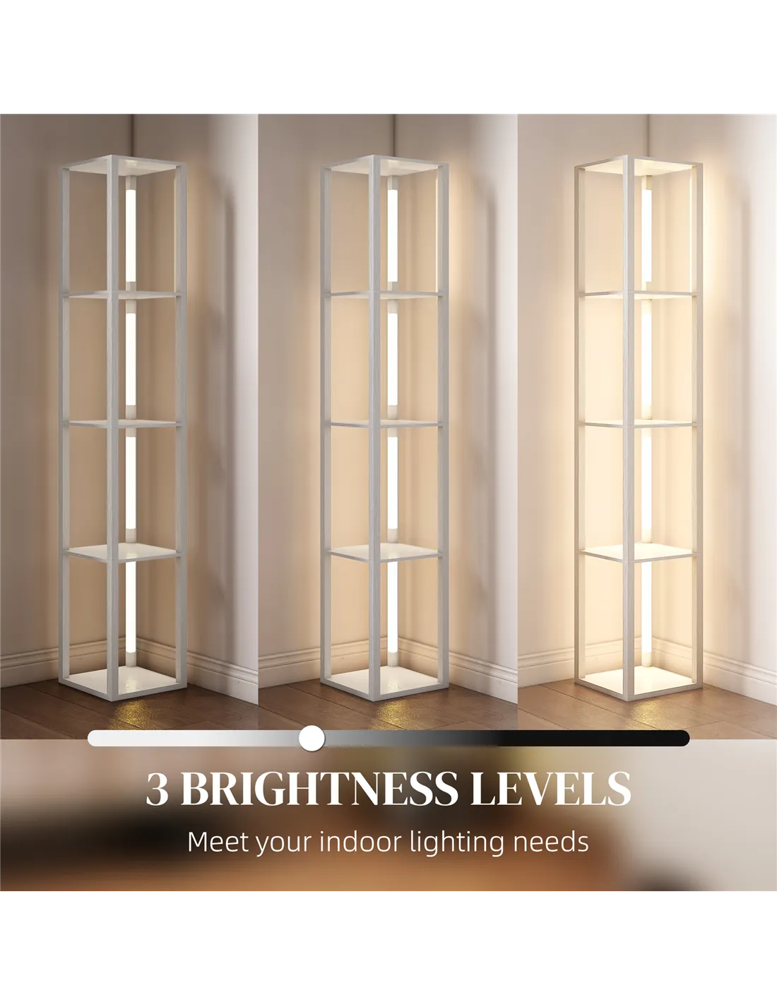 The HOMCOM Floor Lamp with Shelves provides adaptable lighting and essential storage for your UK home. This white floor lamp, a practical furniture piece from FastDaddy, seamlessly combines illumination with organisation. It features a warm white LED lamp, adjustable through three distinct brightness levels. You control the light intensity with a simple foot switch, creating the perfect ambiance for any activity. Four spacious tiers offer significant display and storage opportunities, making it ideal for living rooms or bedrooms. Constructed from durable MDF and plastic, this lamp measures 29L x 29W x 163H cm. Each shelf supports up to 2.3 kg. This functional and stylish lamp enhances your decor while maintaining tidiness. Assembly is required, ensuring a secure structure upon completion.