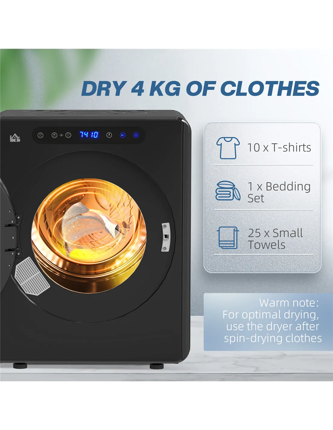 - A: The HOMCOM 4kg Compact Tumble Dryer handles up to 4kg of wet clothes. This accommodates items like 10 t-shirts or one bedding set. For faster drying, load no more than 2.5kg of dry clothes at a time.