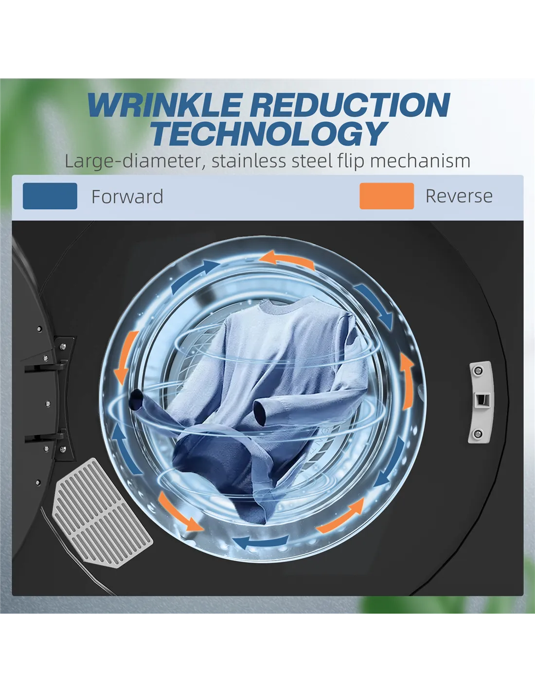 - Reverse tumble action reduces wrinkles in clothes