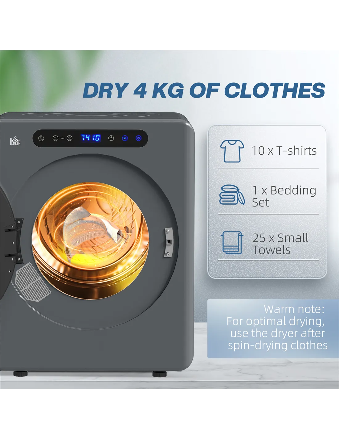 - Warm note: To speed up drying, load no more than 2.5kg of dry clothes at a time