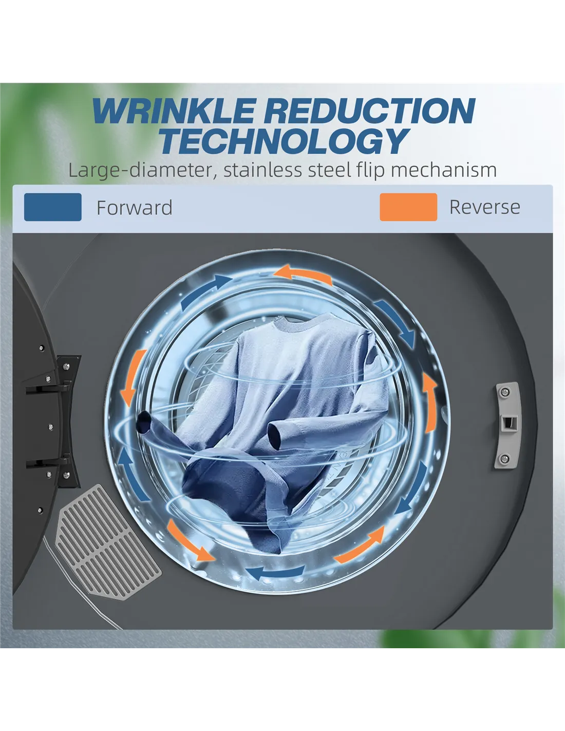 - Reverse tumble action reduces wrinkles in clothes