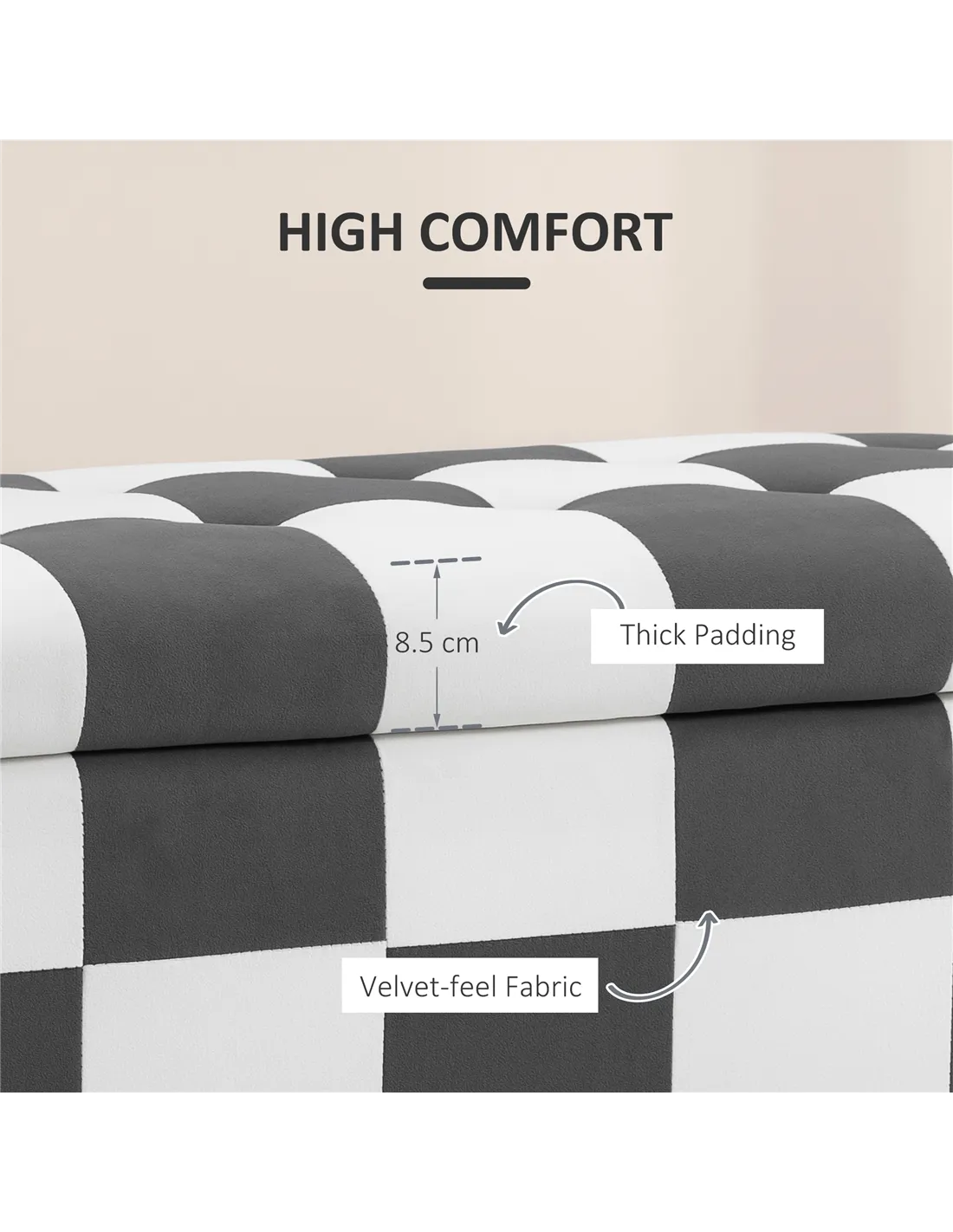 Elevate your home's functionality with the HOMCOM Storage Ottoman, presented in a stylish dark grey and white colour block design. This versatile storage bench, perfectly sized at 114W x 47D x 47H cm, serves as a discreet storage solution, a comfortable footstool, and additional seating. Its plush velvet surface and sturdy wooden legs bring a touch of elegance to any room. You gain significant hidden storage with a 105W x 40D x 28H cm internal compartment, perfect for organising items in your bedroom, hallway, or living room. The hinged, padded lid ensures easy access and offers a comfortable sit. This ottoman supports up to 150kg, providing practical style for UK homes.