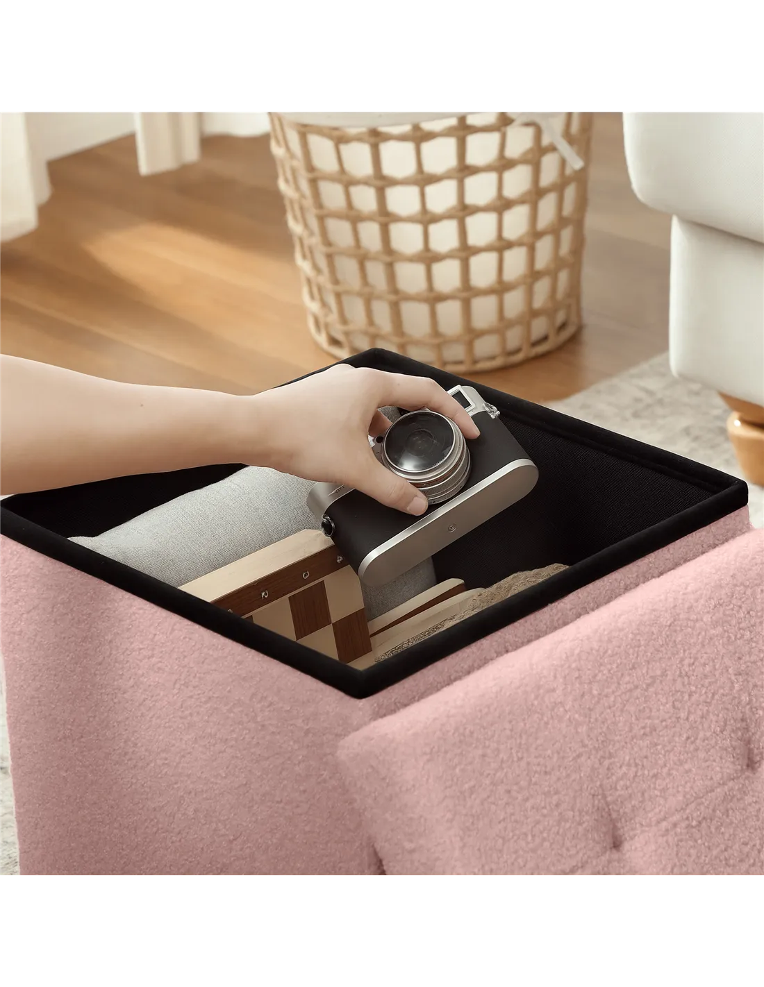 - Ottoman storage box doubles as footrest or extra seating