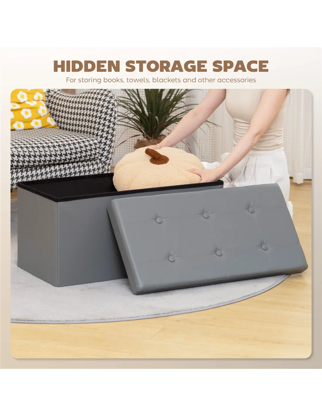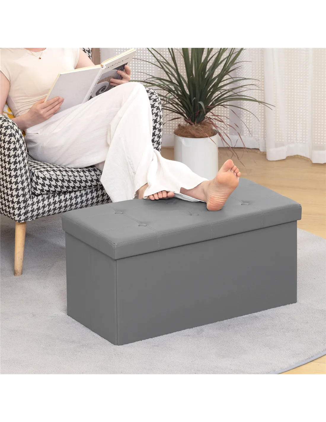 This HOMCOM Storage Ottoman Bench offers an effective solution for decluttering any living space. Its generous 89-litre capacity provides ample room to store blankets, cushions, or household items, creating a more organised environment. Fashioned from elegant grey PU leather with classic button tufting, this ottoman delivers a plush and comfortable seating experience. Use it versatilely as a supportive foot rest, a practical end-of-bed bench, or convenient additional seating for guests. Designed for modern homes, it folds flat in seconds without tools, ensuring straightforward assembly and effortless storage when not needed. Manufactured with UK standard flame-retardant materials, this item provides an essential layer of safety. Position this functional bench in your living room, bedroom, or entryway to combine practicality with sophisticated style.