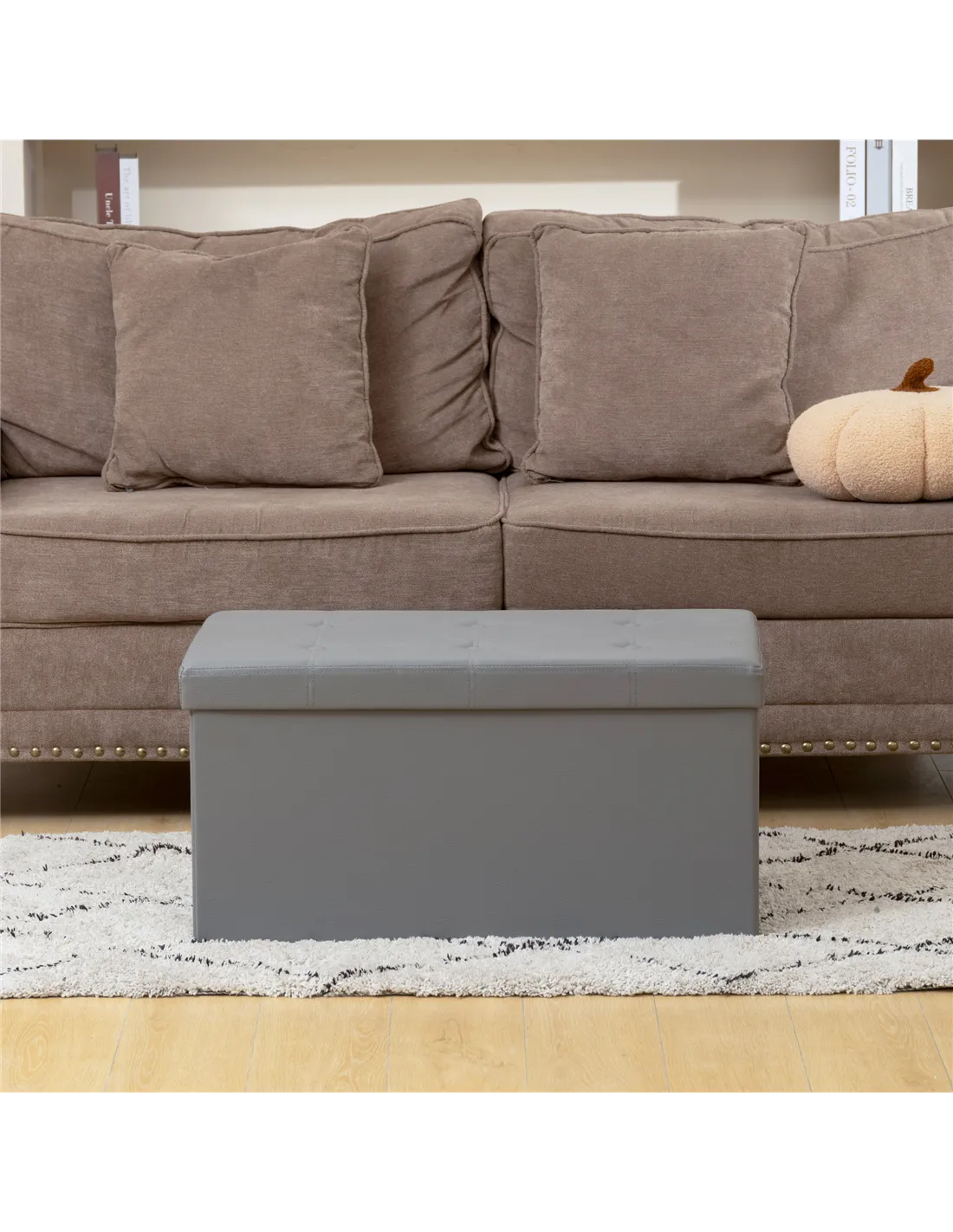 - A: The ottoman is made from elegant grey PU leather, foam, non-woven fabric, and MDF. It also incorporates UK standard flame-retardant materials for safety.