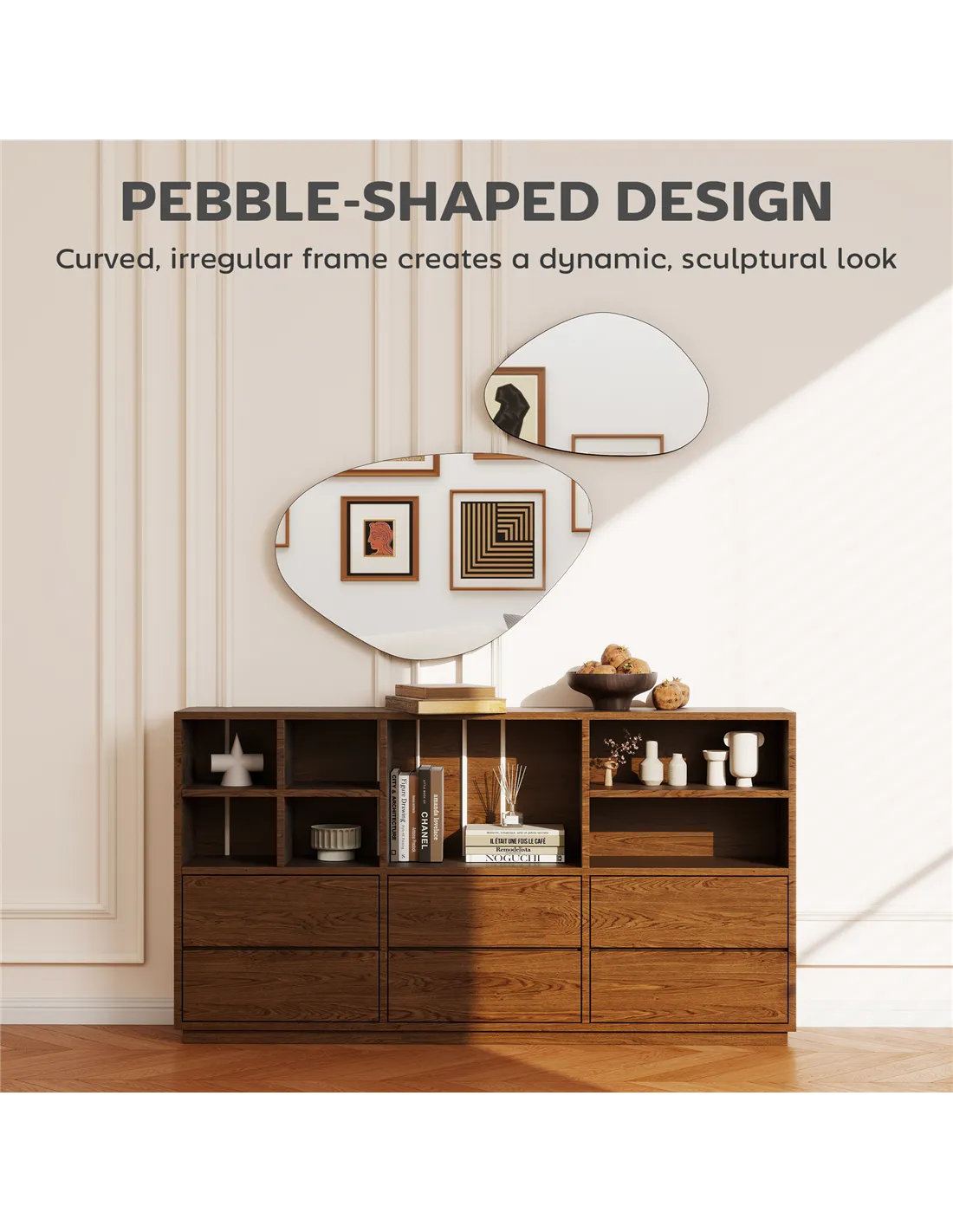 - Features a two-piece pebble mirror set for unique, artistic wall arrangements