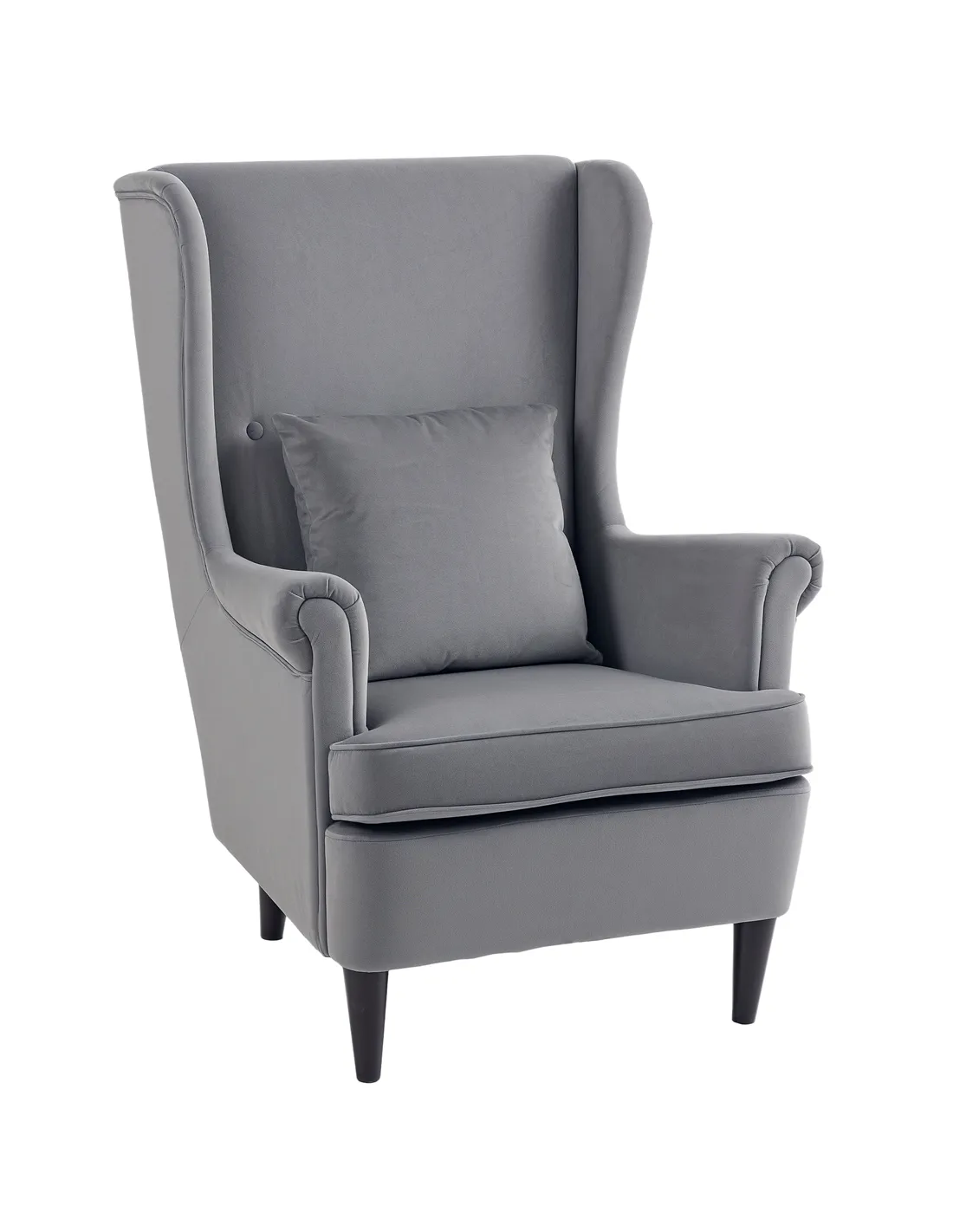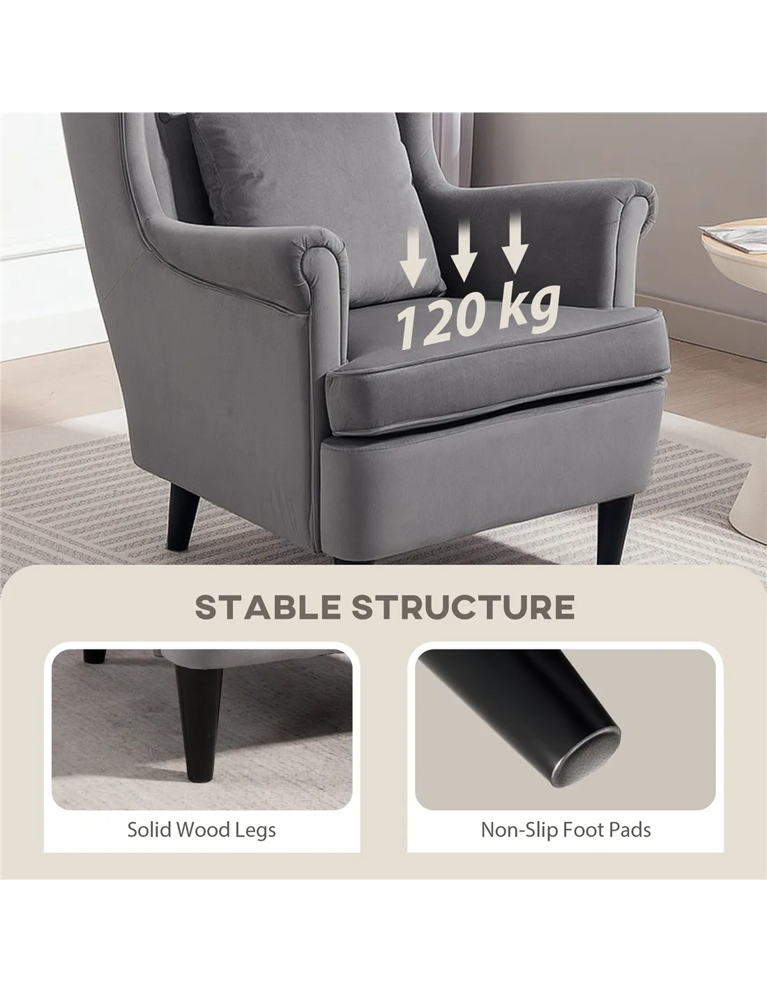 HOMCOM Modern Accent Chair, Upholstered Wingback Armchair with High Backrest and Pillow, Velvet-Feel Fabric Reading Chair with Solid Wood Legs for Living Room, Bedroom, Home Office, Dark Grey