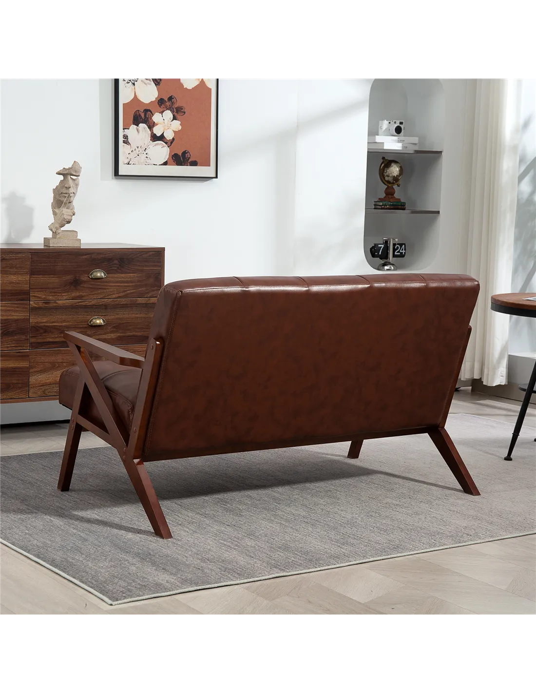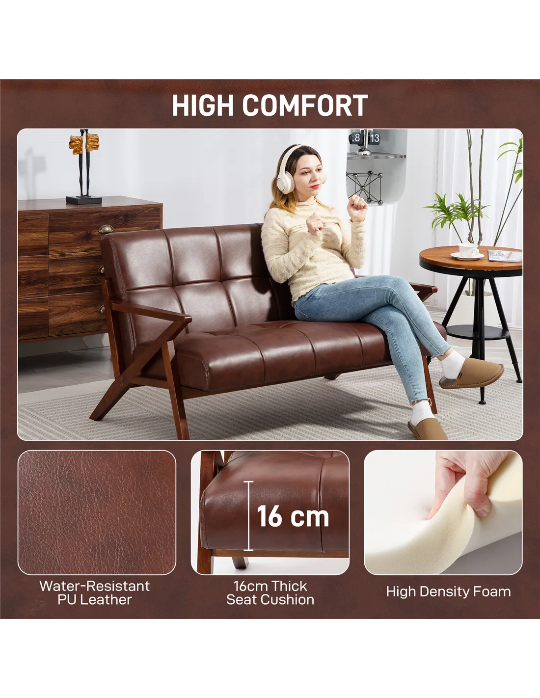 - Q: What material is used for the sofa's upholstery and frame? A: The sofa features brown PU leather upholstery with foam cushioning, supported by a solid beech wood frame.