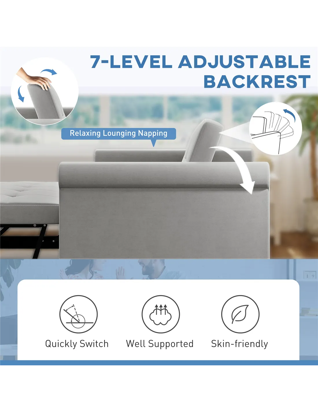 - A: This sofa bed features seven adjustable backrest positions. Adjust it for your preferred sitting or reclining angle.