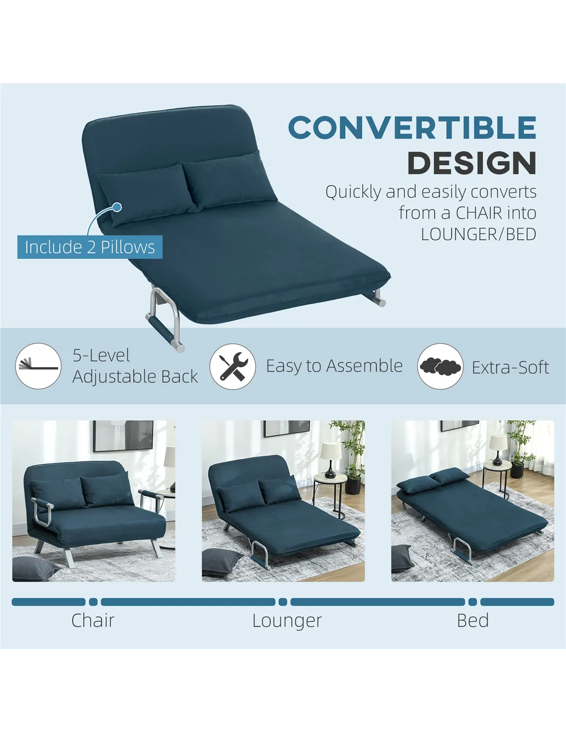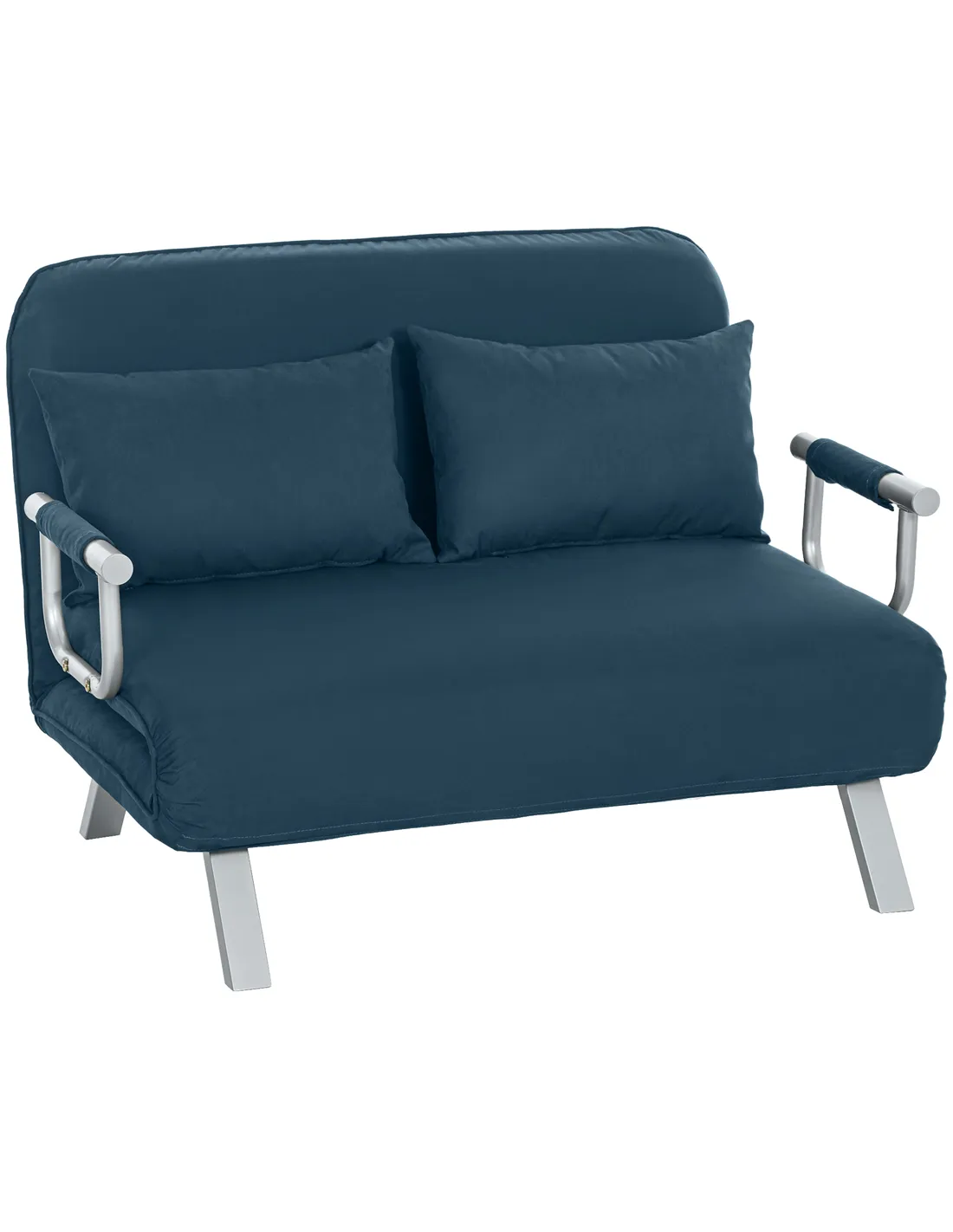 Introducing the HOMCOM Two-Seater Click-Clack Sofa Bed in Navy Blue, a functional and stylish addition for any UK home. This sofa bed provides an immediate solution for compact living areas or unexpected guests. Its innovative click-clack design allows you to effortlessly convert from a comfortable two-seater sofa to a practical bed. Tailor your relaxation with a five-position adjustable backrest, ensuring personalised comfort whether you are sitting or reclining. Enjoy superior comfort day and night, thanks to the high-density foam padding and soft faux suede upholstery. This robust unit includes two matching pillows for enhanced support. Built with a strong, powder-coated metal frame, it supports up to 240 kg, offering durability and peace of mind. Maximise your space with this versatile navy blue sofa bed.