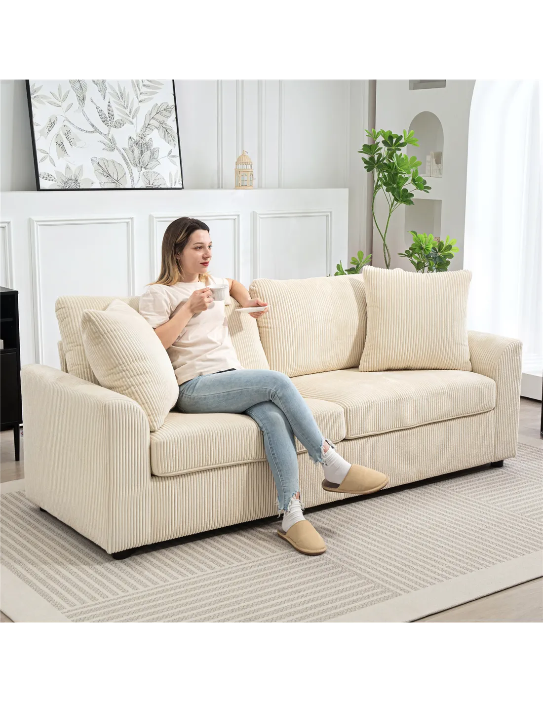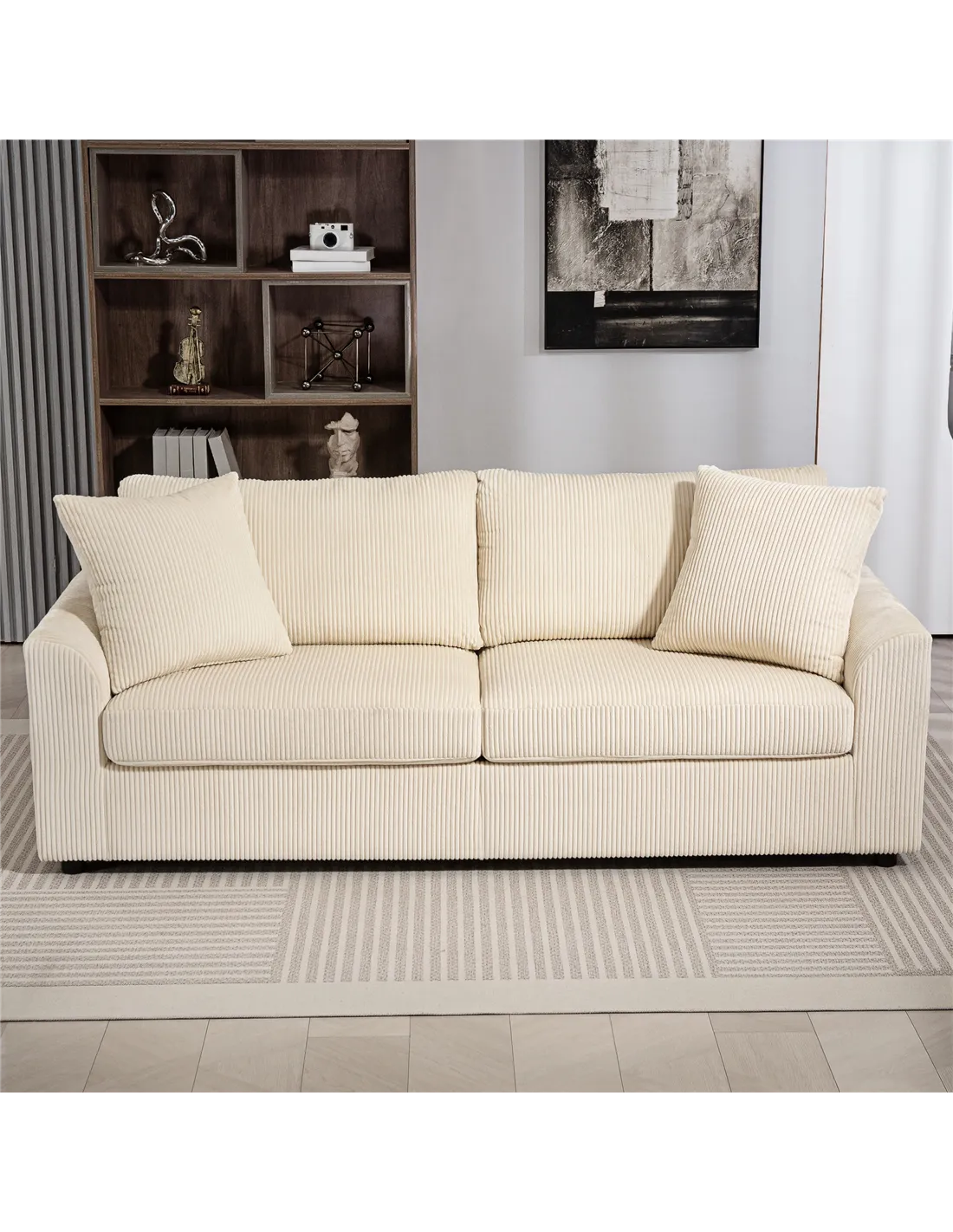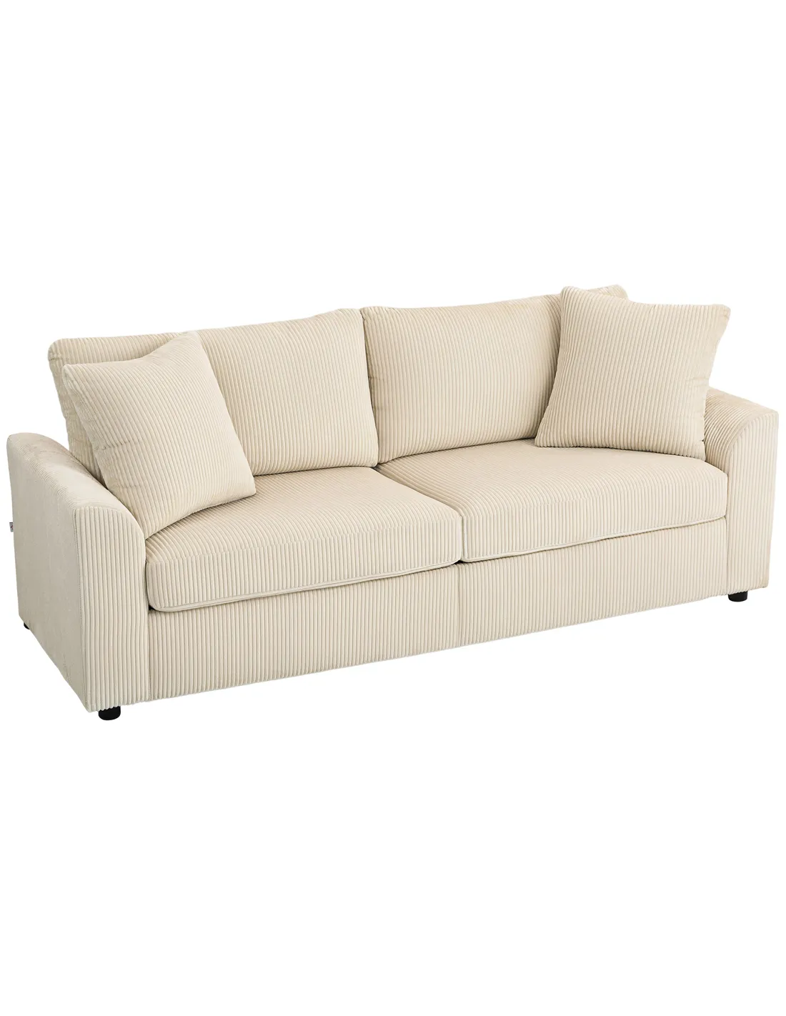 HOMCOM Modern 3 Seater Sofa with Spring Cushion, 212 cm Fabric Jumbo Cord Sofa Couch with 2 Scatter Cushions, Upholstered Corduroy Settee for Living Room, Bedroom, Home Office, Cream White