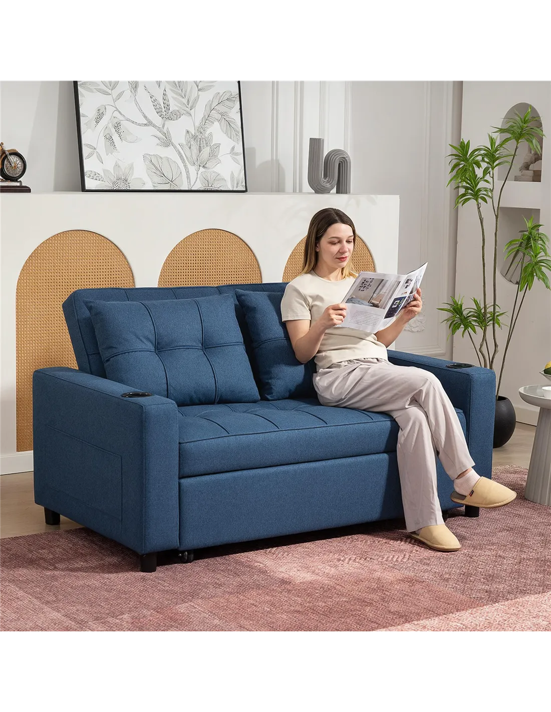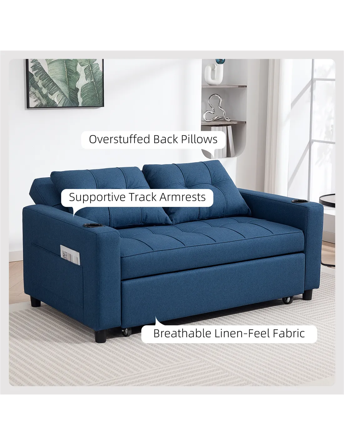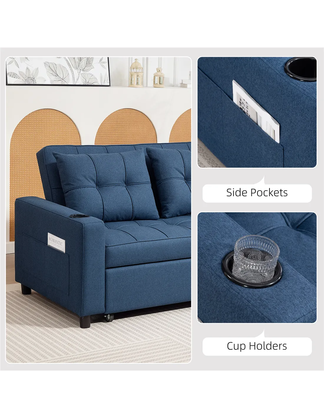 Transform your living space with the HOMCOM Two-Seater Pull-Out Sofa Bed in Dark Blue, ideal for UK homes. This highly versatile piece effortlessly converts from a comfortable loveseat sofa to a relaxing recliner or a practical two-seater sofa bed. You gain an adaptable furniture solution for daily use and unexpected guests. The generous 157 x 190 cm bed area offers ample sleeping room, accommodating taller individuals with ease. Its high-density foam filling ensures consistent comfort and maintains shape through regular use. Adjust the three-position backrest for your preferred relaxation angle. Included pillows add extra support. Keep essentials nearby with integrated cup holders and side pockets. A sturdy steel frame provides a strong, supportive core, with a maximum load capacity of 250 kg.