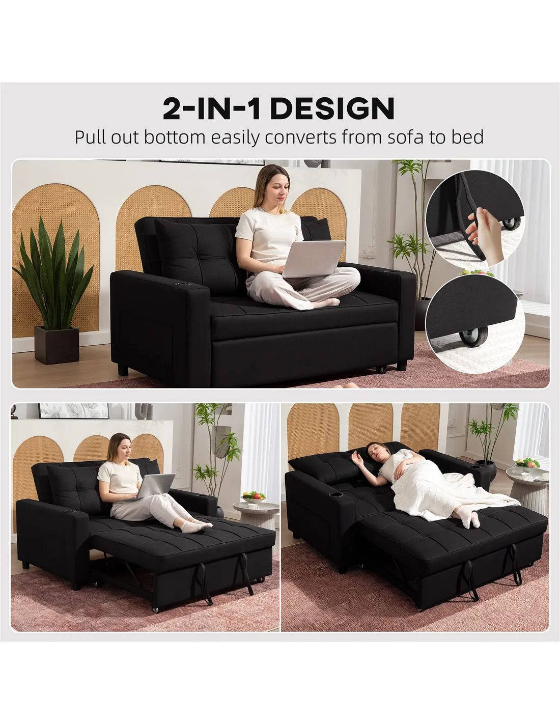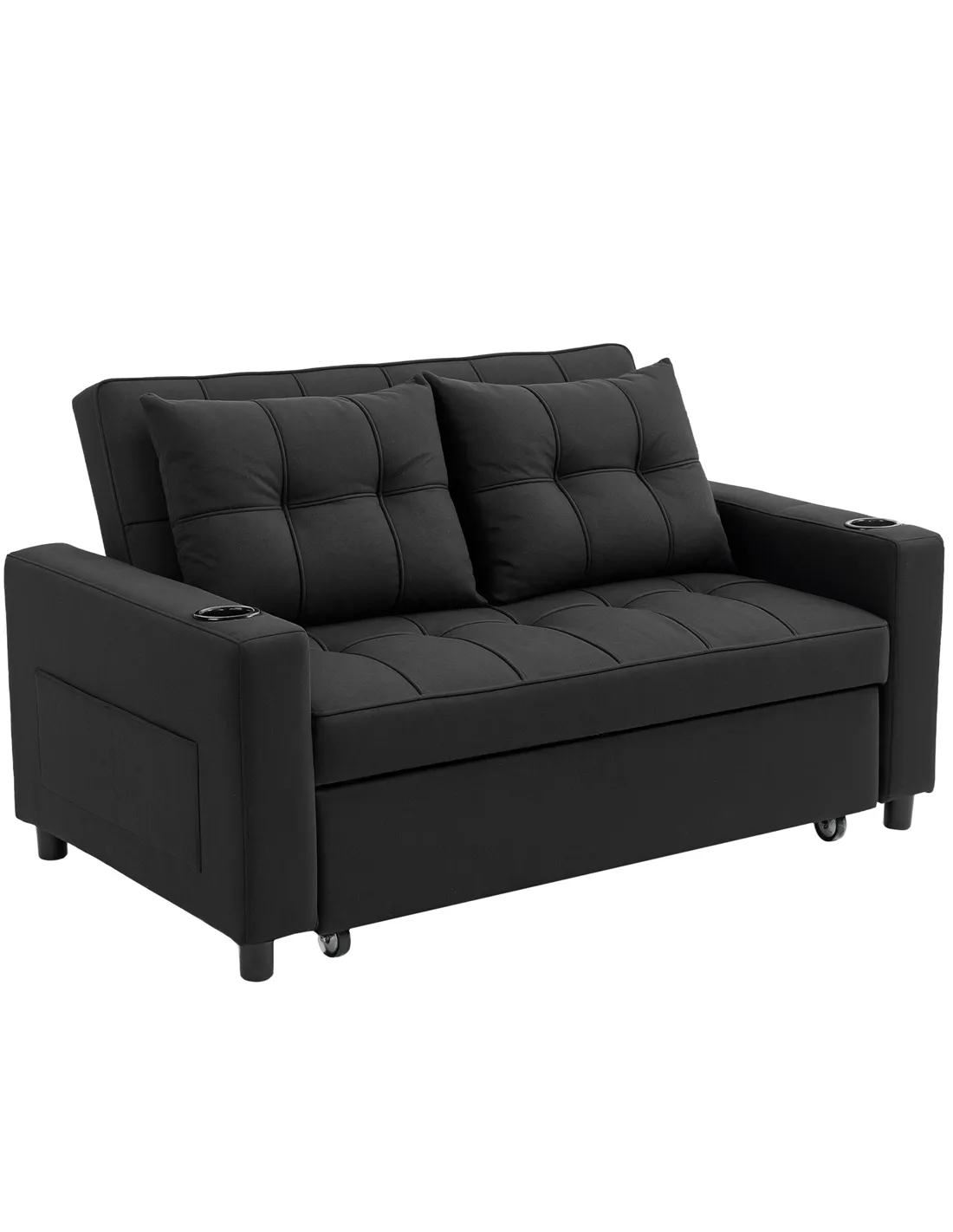 The HOMCOM Two-Seater Pull-Out Sofa Bed in Black enhances any living space. This versatile furniture piece functions as a comfortable loveseat sofa, a relaxing reclining lounger, and a practical two-seater sofa bed. Transition between these uses effortlessly. Its generous 157 x 190 cm bed surface offers ample sleeping space, comfortably accommodating taller individuals. High-density foam filling ensures lasting comfort and maintains the sofa's shape for everyday use. Adjust the backrest to one of three positions for your desired angle. Two included pillows deliver additional support and comfort. Built with a robust steel frame, this sofa bed supports a maximum load of 250 kg. Integrated cup holders and side pockets keep your essentials within easy reach, making it ideal for any UK home.