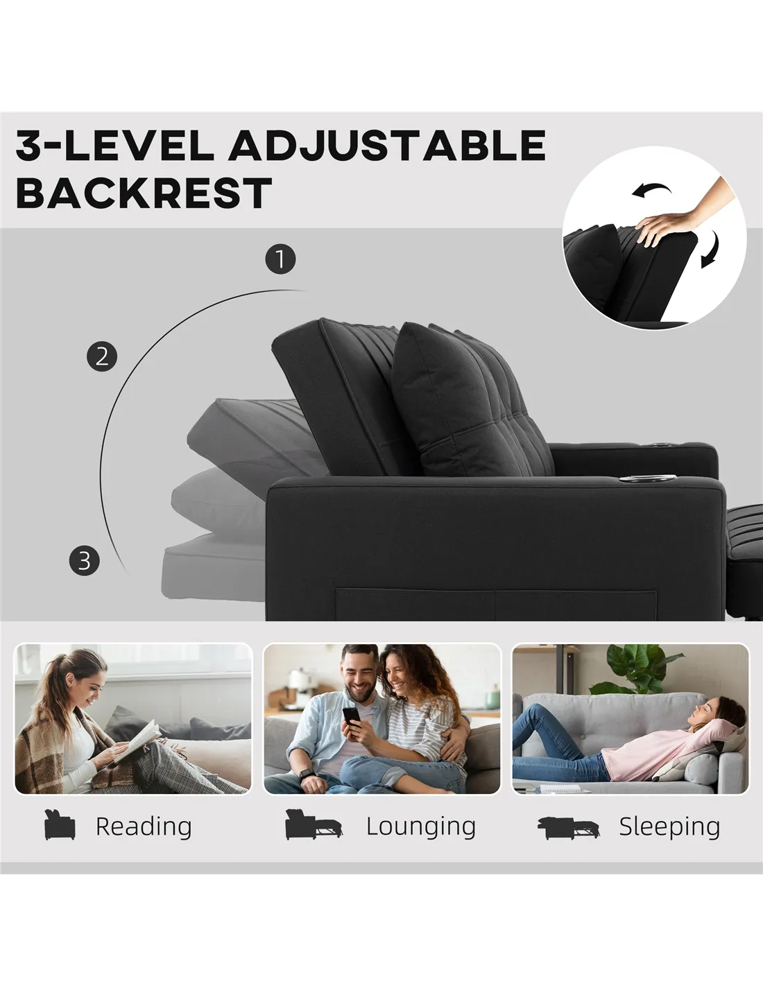 - Three-way design: Loveseat sofa, to recliner, to 2 seater sofa bed. Use it how you want