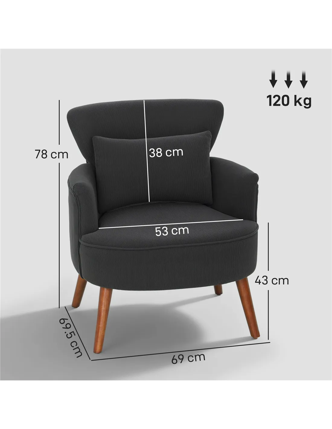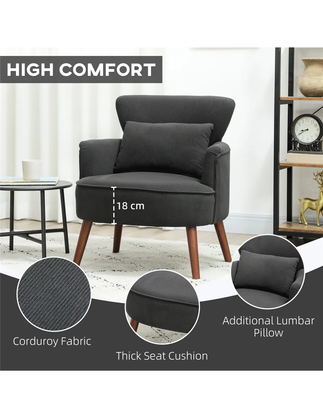 - A: The HOMCOM Corduroy Retro Accent Chair safely supports a maximum load of 120 kg.