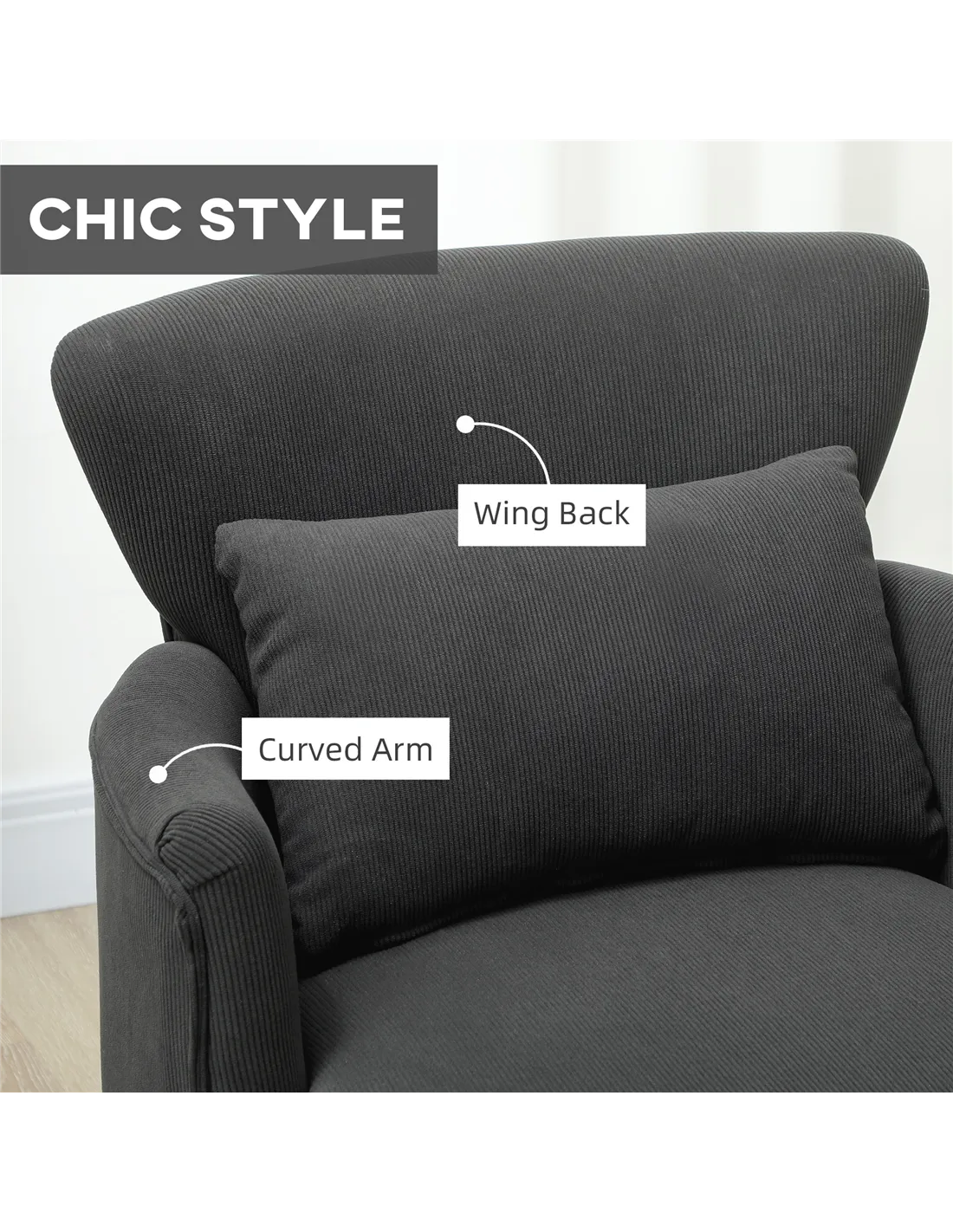 Introduce timeless style and comfort into your home with the HOMCOM Corduroy Retro Accent Chair in Black. This snuggle chair offers a distinctive retro aesthetic, ideal for enhancing any UK living space. Its relaxed cut, wing-shaped back, and corduroy upholstery create character and visual appeal. Designed specifically for small spaces, this armchair provides superior support and comfort. High-density foam padding, 'S' springs, and elastic bands within the seat ensure lasting comfort, complemented by an 18cm thick cushion and extra pillow. A robust wooden frame and four solid rubber wood legs guarantee stability, supporting a maximum load of 120 kg. Place this versatile accent piece in your bedroom, lounge, or hallway to add a sophisticated touch, with adjustable feet ensuring balance on any surface. Its 100% polyester corduroy material combines style with practicality.