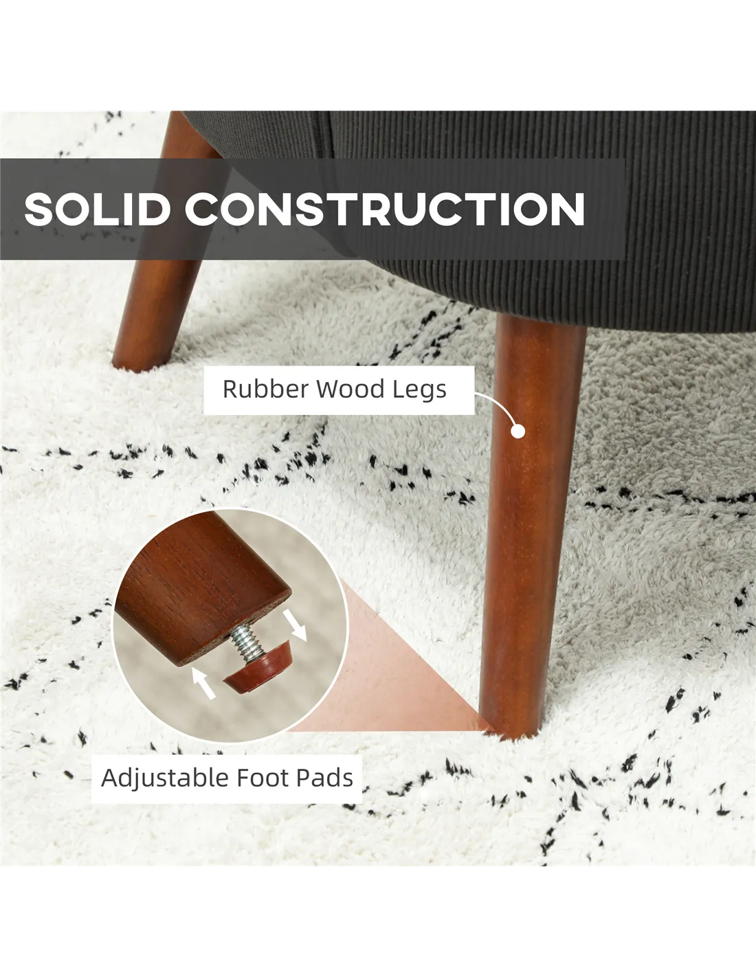 - A: This chair features corduroy (100% Polyester) upholstery, foam padding, an eucalyptus frame, and rubber wood legs.