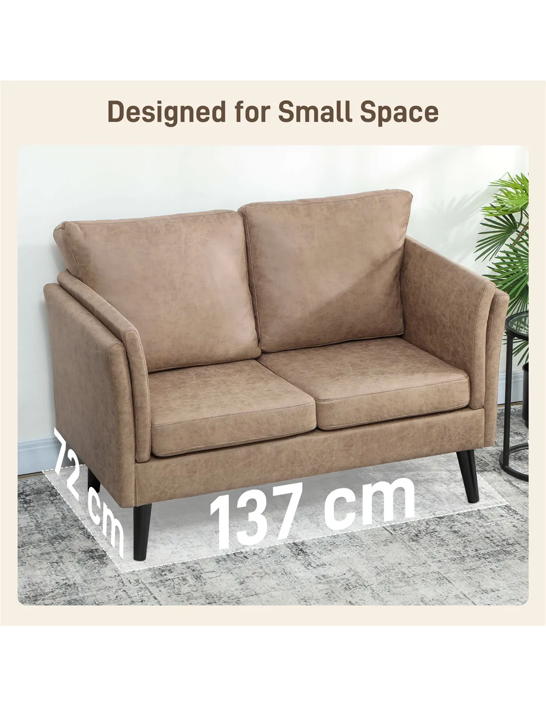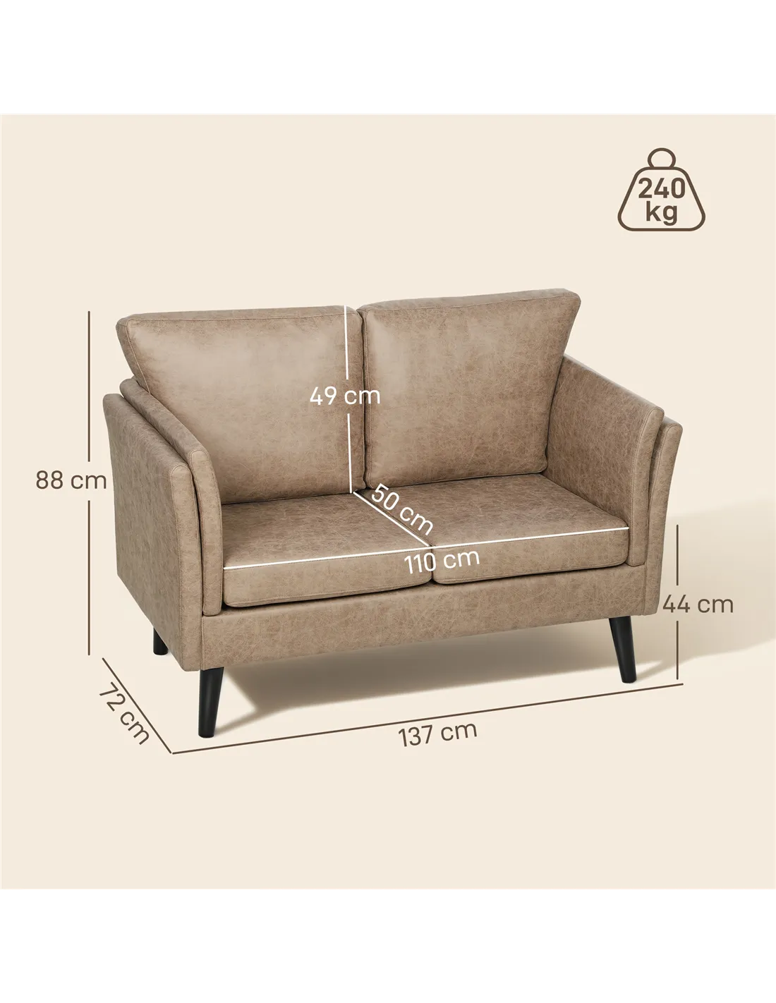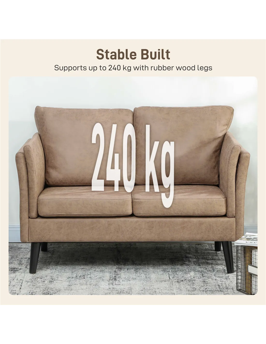 The HOMCOM Two-Seater Leathaire Sofa in Light Brown offers a comfortable and practical seating choice for UK living spaces. This loveseat features resilient, high-density foam filling, designed to maintain its shape and bounce for lasting comfort. Its leathaire upholstery provides the aesthetic and tactile qualities of real leather. This material is soft, breathable, and also straightforward to maintain, ensuring your sofa remains looking good with minimal upkeep. Robust rubber wood legs provide strong, stable support. The sofa's minimal design integrates seamlessly into a range of home styles. With a 240 kg maximum load capacity, it offers reliable seating for everyday use. Its 12 cm base distance makes cleaning underneath simple. This sofa delivers on both style and functionality.Features: