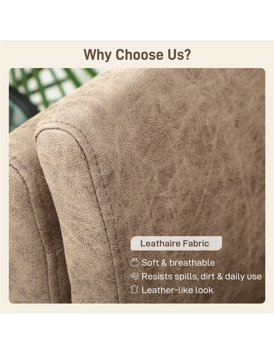 - Leathaire upholstery looks and feels like real leather: easy to maintain too