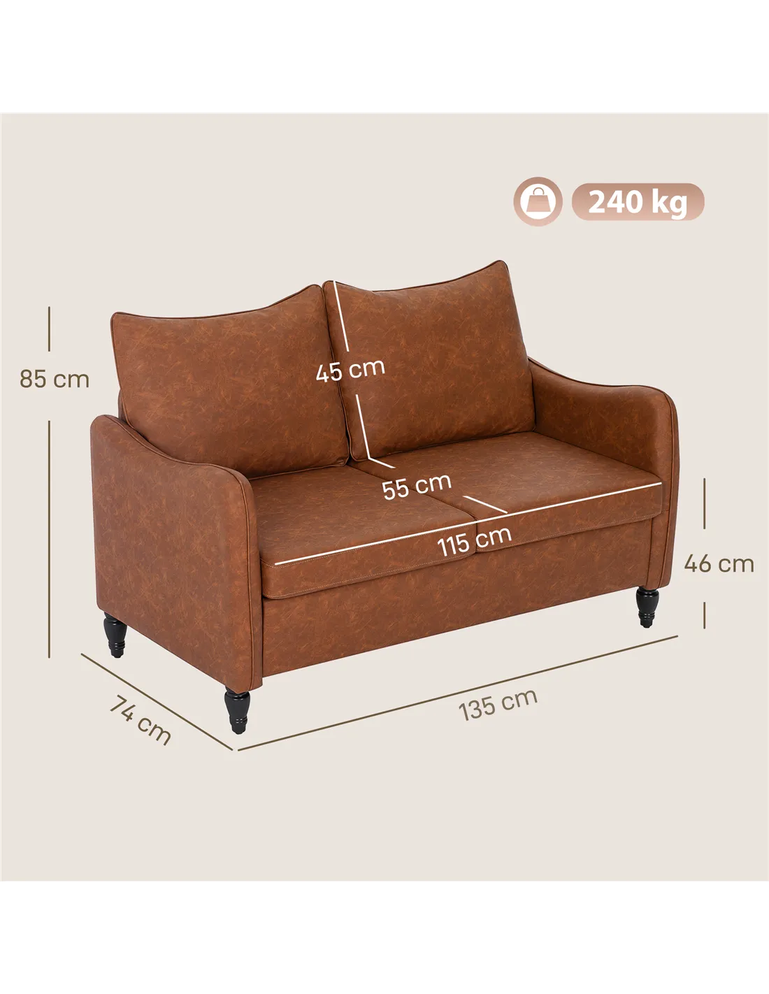 A: The HOMCOM Faux Leather Marble-Effect Two-Seater Sofa supports a maximum load of 240 kg.