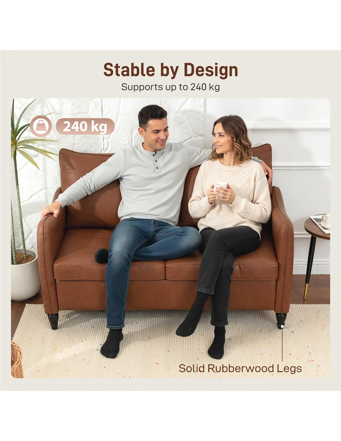 A: This sofa is constructed from PU leather for upholstery, sponge for padding, and rubberwood for the legs.