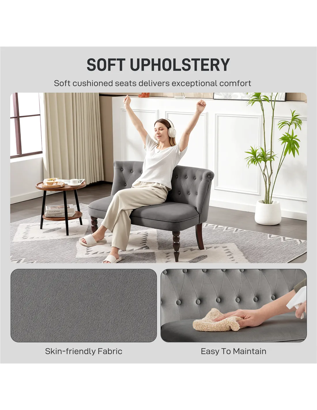 - Velvet-feel upholstery is soft and beautiful