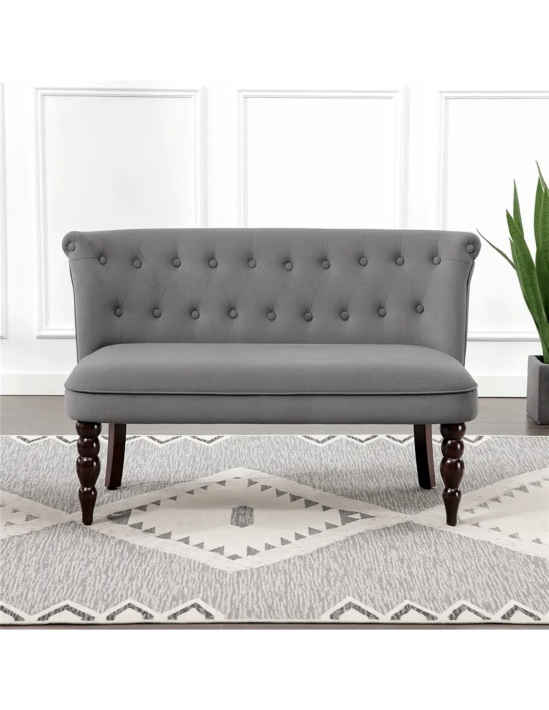 This HOMCOM Velvet 2 Seater Sofa offers deep comfort and elegant style for your home. Its button tufted wingback design and charcoal grey velvet-feel upholstery create a refined, vintage aesthetic. The loveseat features robust rubber wood legs with adjustable anti-slip feet, ensuring stable support for up to 220kg. Filled with soft sponge, this sofa provides comfortable seating in living rooms and bedrooms. Its gourd-shaped legs add distinct character. Product dimensions are 120W x 67D x 78Hcm. This compact sofa fits various spaces. It delivers an appealing seating option, enhancing any room with its distinctive design and sturdy build. Assembly is required. This sofa combines visual appeal with practical function, serving as a standout furniture item for UK residents.