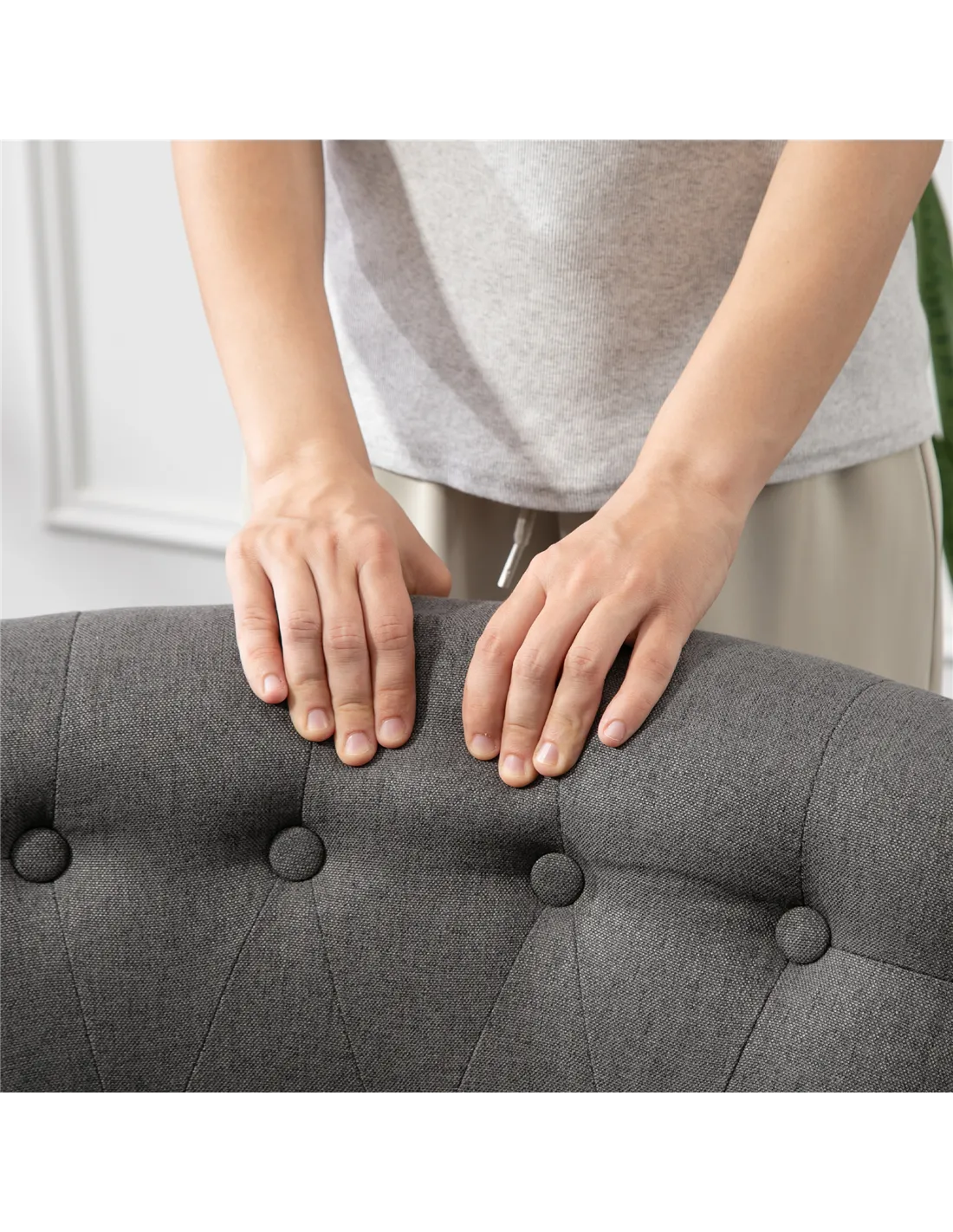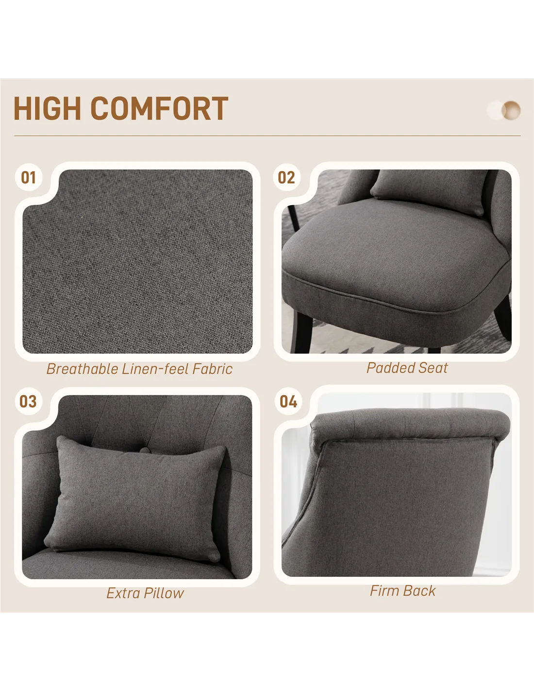 Enhance your living space with the HOMCOM Charcoal Grey Fabric Accent Chair. This versatile single sofa, also functioning as a dining or tub chair, offers a stylish addition to any home. Its linen-look fabric upholstery provides easy maintenance, complementing the chair's vintage aesthetic. Solid rubber wood legs ensure stability and balance, supporting up to 150kg. Experience lasting comfort with a thickly padded seat and a supportive, curved backrest. The chair includes a matching, machine-washable pillow for added relaxation. Its retro design, featuring delicate button tufting and a scrolled back, makes a distinctive statement in your living room or dining area. Foot pads protect your floors from damage. This HOMCOM chair combines practicality with elegant design, providing a comfortable and durable seating solution for your UK home.
