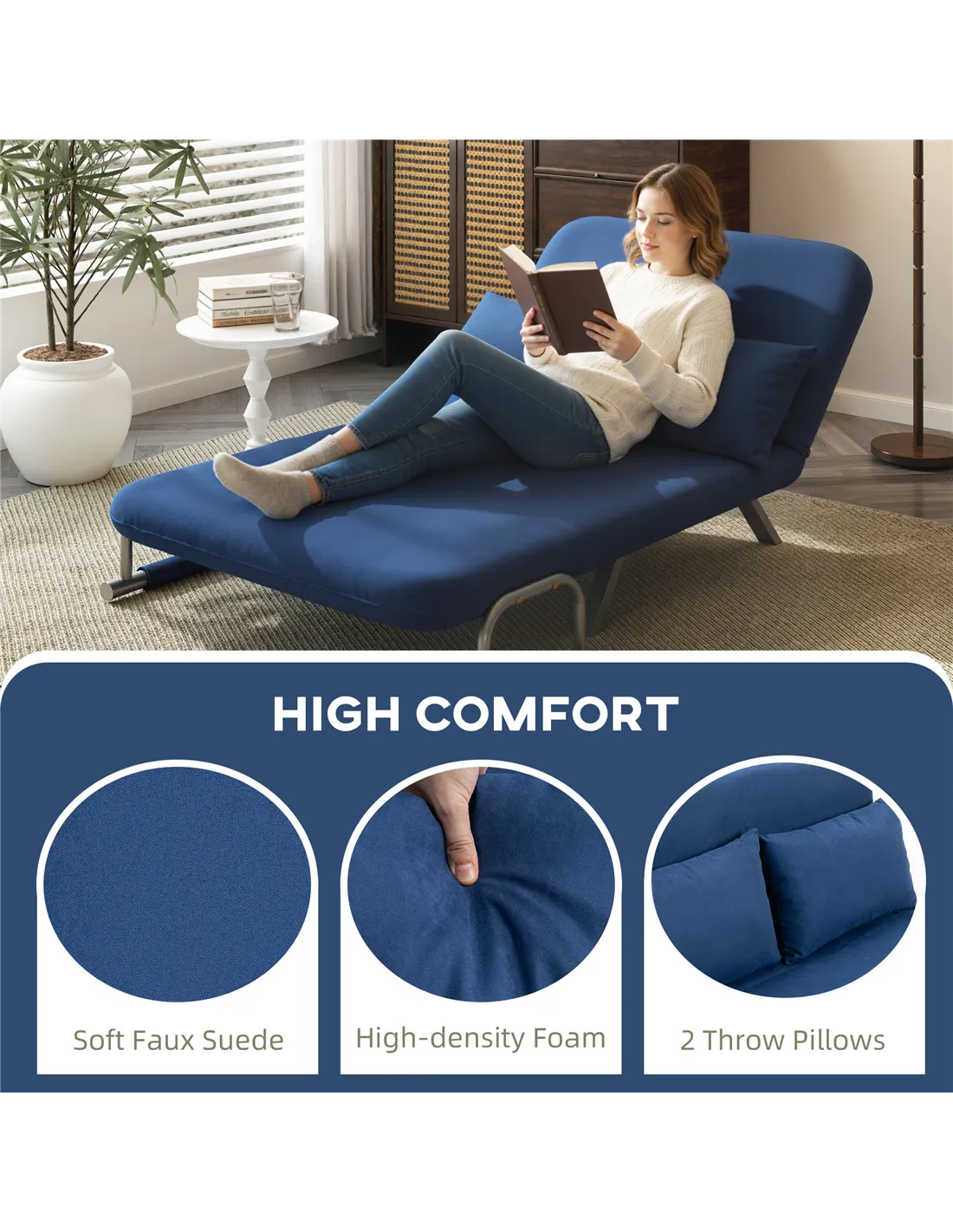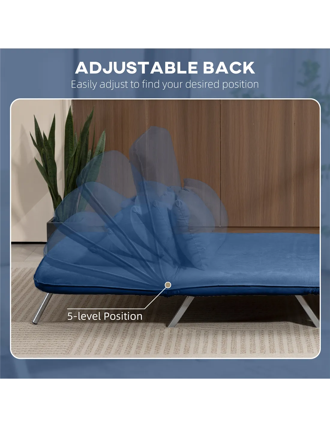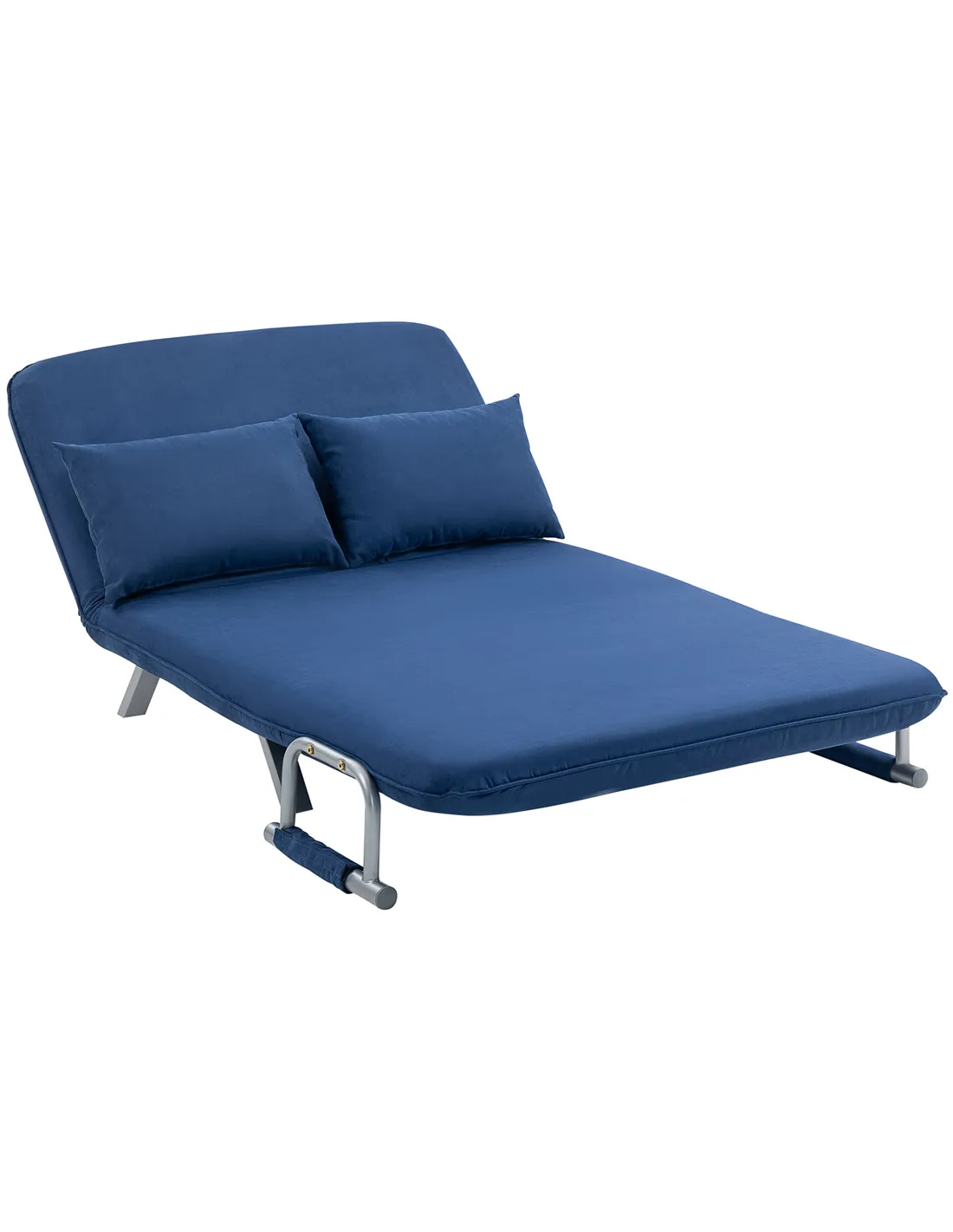 Maximise your living space with the HOMCOM Two-Seater Click-Clack Sofa Bed in Dark Blue. This versatile furniture transforms effortlessly from a comfortable two-seater sofa to a practical single bed. The intuitive click-clack mechanism ensures quick, simple conversion, adapting to your needs instantly. A five-position adjustable back offers personalised comfort for various activities, from upright sitting to relaxed reclining. Padded with high-density foam and upholstered in soft, durable faux suede (100% Polyester), this sofa bed provides a soft, supportive experience day and night. Two matching pillows deliver additional comfort and support. Its robust powder-coated metal frame provides a strong, stable foundation, supporting up to 240 kg. This item delivers a smart, functional solution for UK homes.