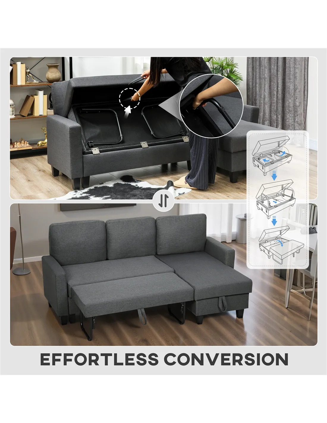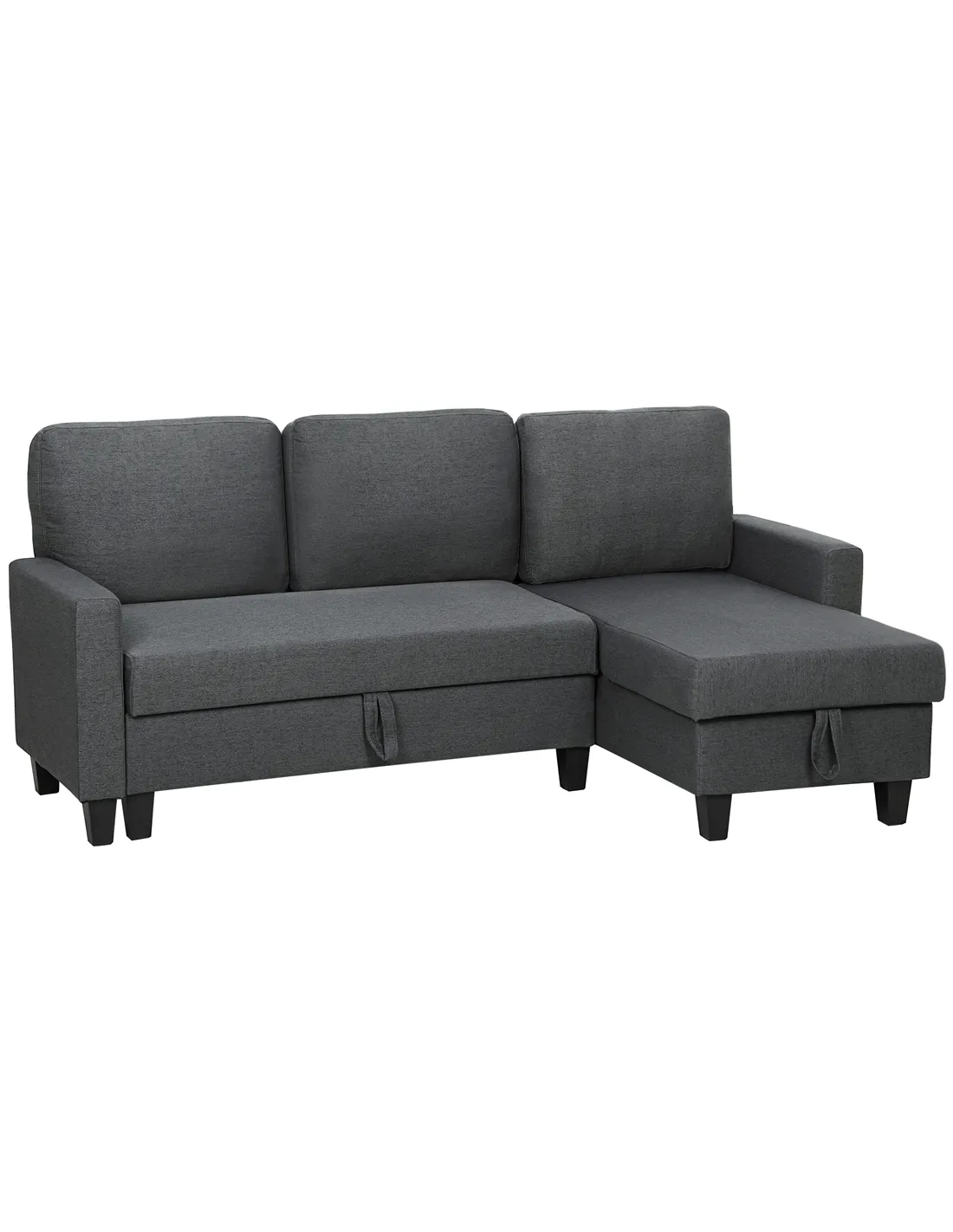 The HOMCOM Three-Seater Storage Sofa Bed in Charcoal Grey provides versatile living for your UK home. This essential piece effortlessly converts from a comfortable three-seater sofa into a guest bed within seconds. It offers a practical solution for unexpected overnight guests or simply relaxing. A discreet storage compartment is integrated into the chaise, providing ample space for blankets, cushions, and accessories, keeping your living area tidy. You arrange the reversible chaise on either side to suit your room layout. High-density foam filling, combined with S-springs and elastic bands, ensures lasting comfort and shape retention. The durable linen-look 100% polyester upholstery delivers a soft feel. Supported by a robust eucalyptus wood and steel blend frame, this sofa bed handles up to 330 kg. Assembly is straightforward, making it a functional addition.