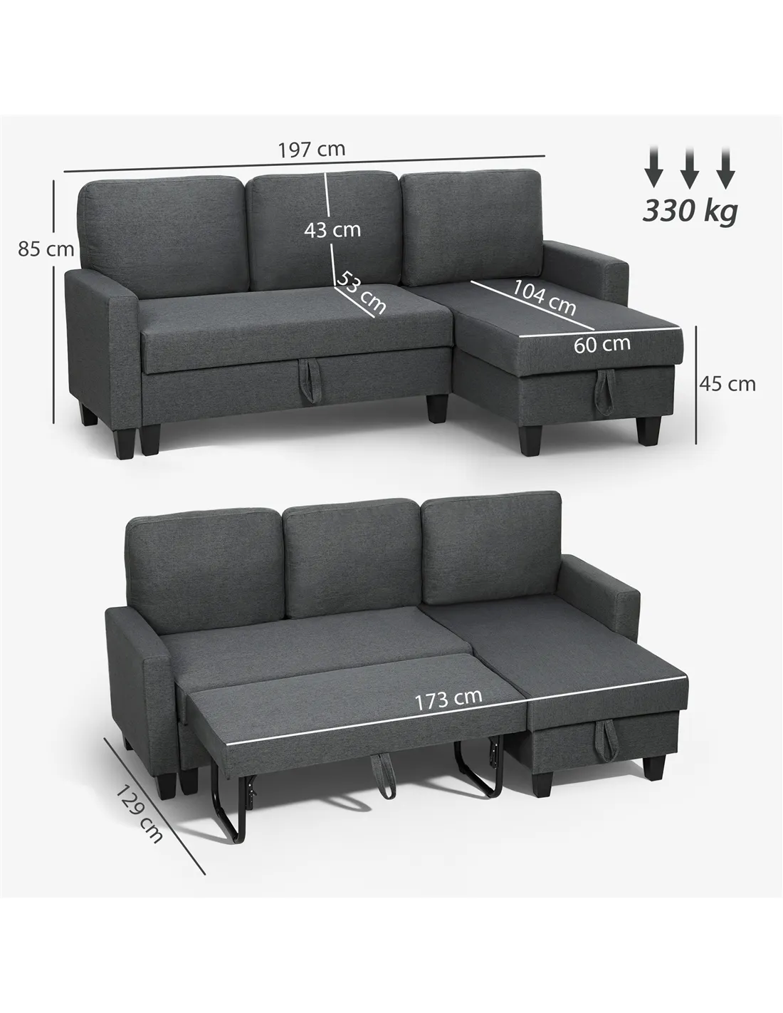 - A: The sofa bed has a maximum load capacity of 330 kg.
