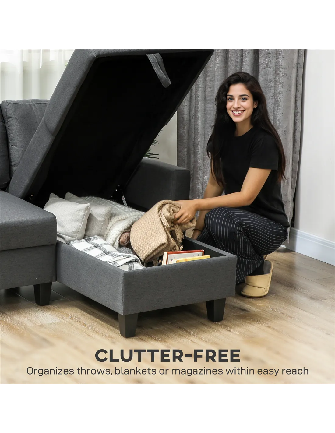 - Hidden storage compartment in the chaise. Room for blankets, soft furnishings and more